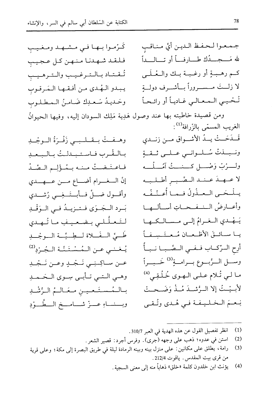 ومن قصيدة خاطبته بها عند وصول هدية ملك السودان إليه، وفيها الحيوان الغريب المسمى بالزرافة:
