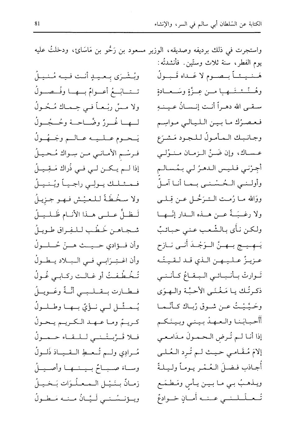 واستجرت في ذلك برديفه وصديقه، الوزير مسعود بن رحو بن ماساي، ودخلت عليه يوم الفطر، سنة ثلاث وستين. فأنشدته:
