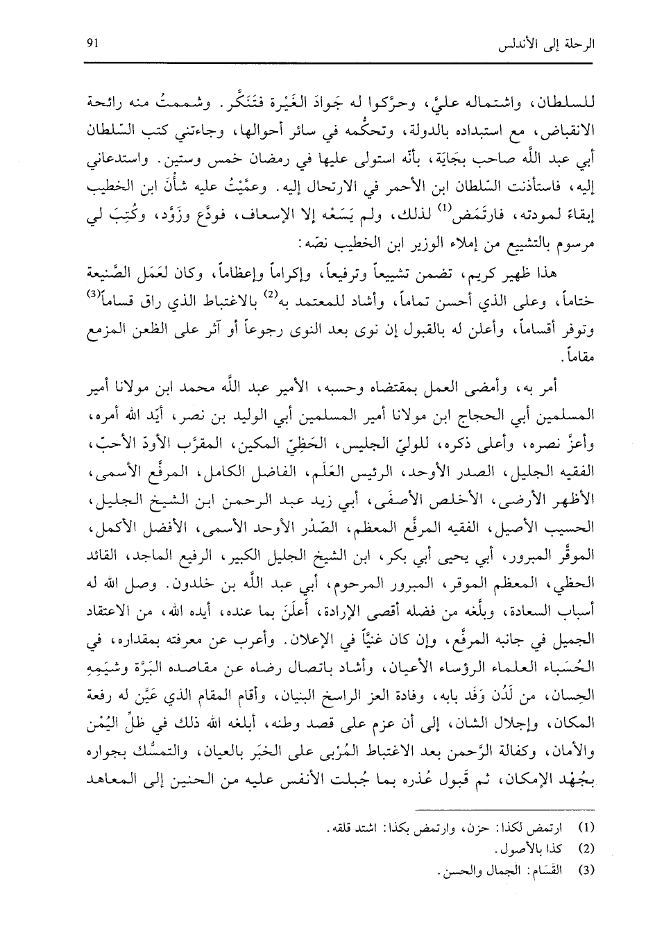 أمر به، وأمضى العمل بمقتضاه وحسبه، الأمير عبد الله محمد ابن مولانا أمير المسلمين أبي الحجاج ابن مولانا أمير المسلمين أبي الوليد بن نصر، أيد الله أمره، وأعز نصره، وأعلى ذكره، للولي الجليس، الحظي المكين، المقرب الأود الأحب، الفقيه الجليل، الصدر الأوحد، الرئيس العلم، الفاضل الكامل، المرفع الأسمى، الأظهر الأرضى، الأخلص الأصفى، أبي زيد عبد الرحمن بن الشيخ الجليل، الحسيب الأصيل، الفقيه المرفع المعظم، الصدر الأوحد الأسنى، الأفضل الأكمل، الموقر المبرور، أبي يحيى أبي بكر، ابن الشيخ الجليل الكبير، الرفيع الماجد، القائد الحظي، المعظم الموقر، المبرور المرحوم، أبي عبد الله بن خلدون. وصل الله له أسباب السعادة، وبلغه من فضله أقصى الإرادة، أعلن بما عنده، أيده الله، من الاعتقاد الجميل