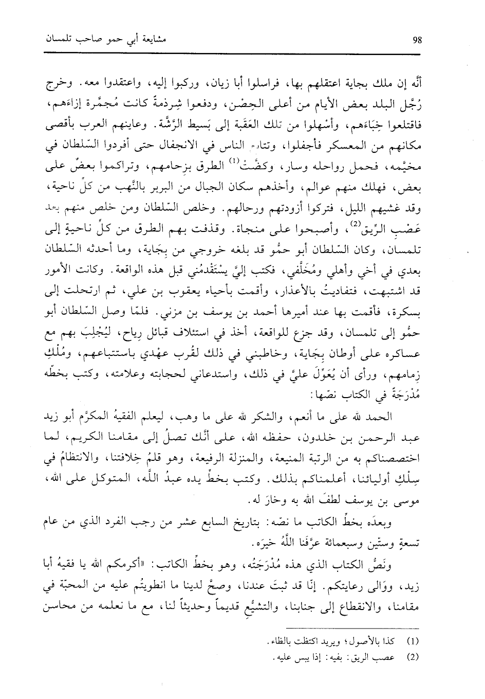 الحمد لله على ما أنعم، والشكر لله على ما وهب، ليعلم الفقيه المكرم أبو زيد عبد الرحمن بن خلدون، حفظه الله، على أنك تصل إلى مقامنا الكريم، لما اختصصناكم به من الرتبة المنيعة، والمنزلة الرفيعة، وهو قلم خلافتنا، والانتظام في سلك أوليائنا، أعلمناكم بذلك. وكتب بخط يده عبد الله، المتوكل على الله، موسى بن يوسف لطف الله به وخار له.