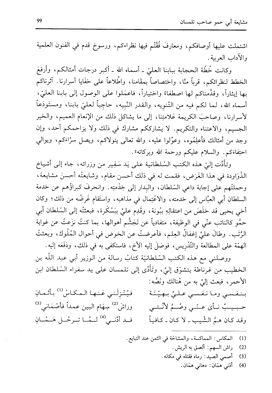 ووصلني مع هذه الكتب السلطانية كتاب رسالة من الوزير أبي عبد الله بن الخطيب من غرناطة يتشوق إلي، وتأدى إلى تلمسان على يد سفراء السلطان ابن الأحمر، فبعث إلي به من هنالك ونصه: