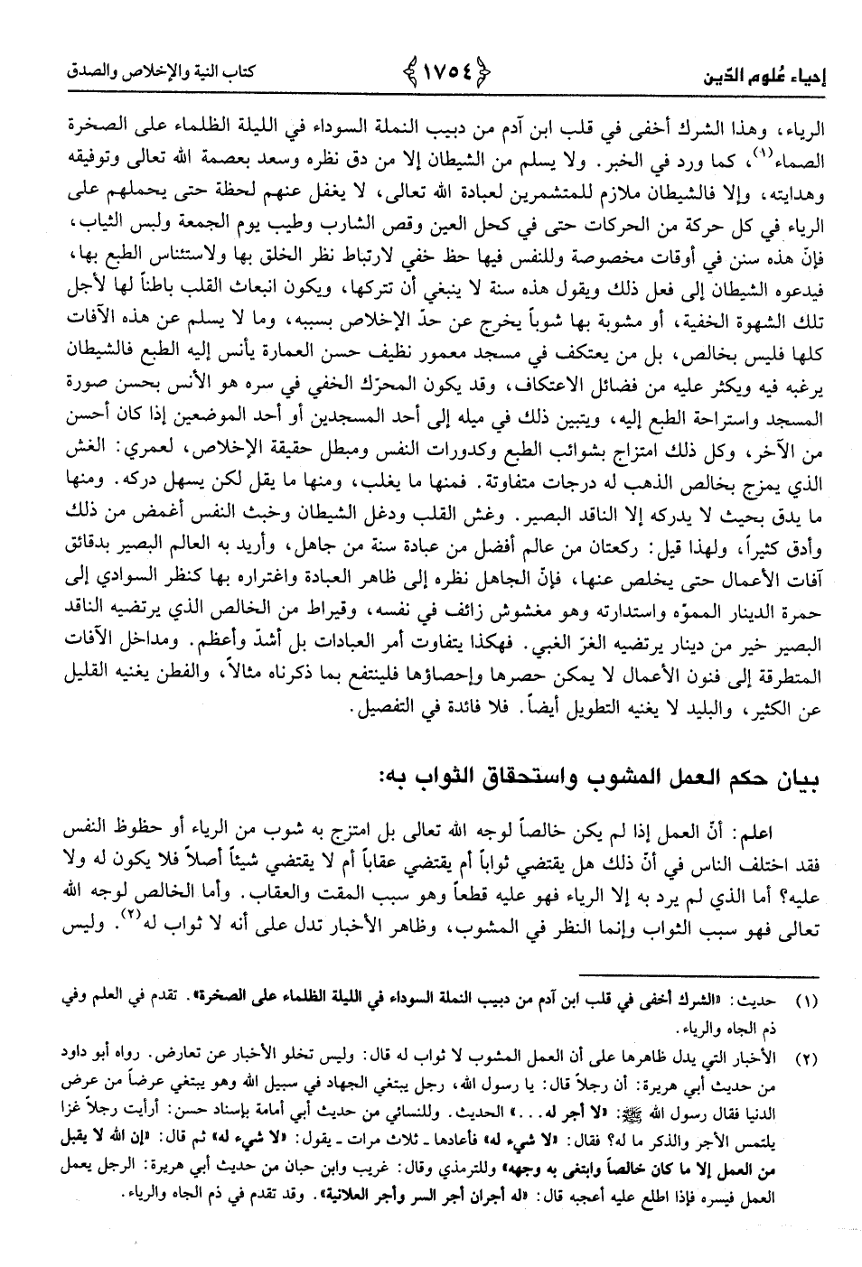 رَوَاهُ أَبُو دَاوُد من حَدِيث أبي هُرَيْرَة: أَن رجلا قَالَ يَا رَسُول الله رجل يَبْتَغِي الْجِهَاد فِي سَبِيل الله وَهُوَ يَبْتَغِي عرضا من عرض الدُّنْيَا فَقَالَ رَسُول الله صَلَّى الله عَلَيْهِ وَسلم «لَا أجر لَهُ ... الحَدِيث» وللنسائي من حَدِيث أبي أُمَامَة بِإِسْنَاد حسن: أَرَأَيْت رجلا غزا يلْتَمس الْأجر وَالذكر مَا لَهُ؟ فَقَالَ «لَا شَيْء لَهُ» فَأَعَادَهَا - ثَلَاث مَرَّات - يَقُول «لَا شَيْء لَهُ» ثمَّ قَالَ «إِن الله لَا يقبل من الْعَمَل إِلَّا مَا كَانَ خَالِصا وابتغى بِهِ وَجهه» وللترمذي وَقَالَ غَرِيب وَابْن حبَان من حَدِيث أبي هُرَيْرَة: الرجل يعْمل الْعَمَل فيسره فَإِذا اطلع عَلَيْهِ أعجبه قَالَ «لَهُ أَجْرَانِ أجر السِّرّ وَأجر الْعَلَانِيَة» وَقد تقدم فِي ذمّ الجاه والرياء.
