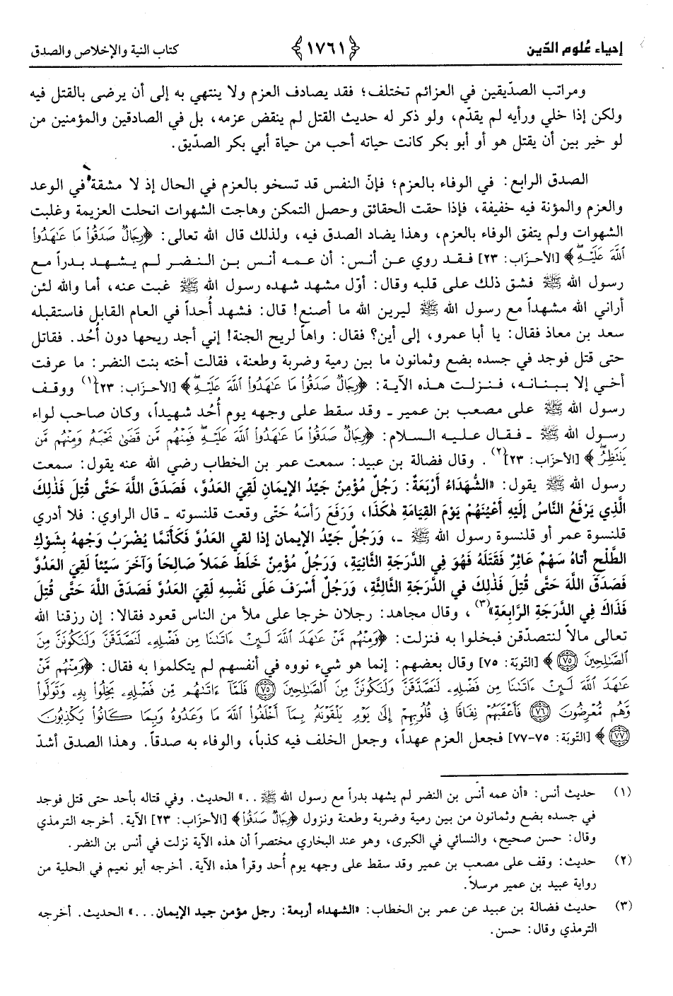 3 - حَدِيث فضَالة بن عبيد عَن عمر بن الْخطاب "الشُّهَدَاء أَرْبَعَة: رجل مُؤمن جيد الْإِيمَان لقى الْعَدو فَصدق الله حَتَّى قتل فَذَلِك الَّذِي يرفع النَّاس إِلَيْهِ أعنيهم يَوْم الْقِيَامَة هَكَذَا "وَرفع رَأسه حَتَّى وَقعت قلنسوته - قَالَ الرَّاوِي: فَلَا أَدْرِي قلنسوة رَسُول الله صَلَّى الله عَلَيْهِ وَسلم - «وَرجل جيد الْإِيمَان إِذا لقى الْعَدو فَكَأَنَّمَا يضْرب وَجهه بشوك الطلح أَتَاهُ سهم عائر فَقتله فَهُوَ فِي الدرجَة الثَّانِيَة، وَرجل مُؤمن خلط عملا صَالحا وَآخر سَيِّئًا لقى الْعَدو فَصدق الله حَتَّى قتل فَذَلِك فِي الدرجَة الثَّالِثَة، وَرجل أسرف عَلَى نَفسه لقى الْعَدو فَصدق الله حَتَّى قتل فَذَاك فِي الدرجَة الرَّابِعَة»