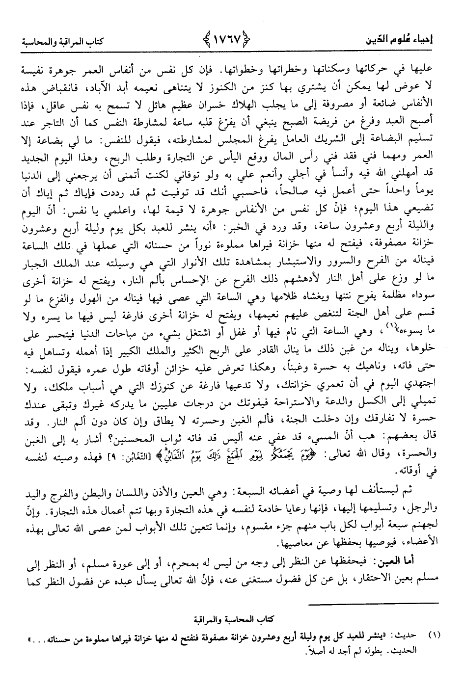 1 - حَدِيث «ينشر للْعَبد بِكُل يَوْم وَلَيْلَة أَربع وَعِشْرُونَ خزانَة مصفوفة فَيفتح لَهُ مِنْهَا خزانَة فيراها مَمْلُوءَة نورا من حَسَنَاته الَّتِي عَملهَا فِي تِلْكَ السَّاعَة فيناله من الْفَرح وَالسُّرُور والاستبشار بمشاهدة تِلْكَ الْأَنْوَار الَّتِي هِيَ وسيلته عِنْد الْملك الْجَبَّار مَا لَو وزع عَلَى أهل النَّار لأدهشهم ذَلِك الْفَرح عَن الإحساس بألم النَّار، وَيفتح لَهُ خزانَة أُخْرَى سَوْدَاء مظْلمَة يفوح نتنها ويغشاه ظلامها وَهِي السَّاعَة الَّتِي عَصَى فِيهَا فيناله من الهول والفزع مَا لَو قسم عَلَى أهل الْجنَّة لتنغص عَلَيْهِم نعيمها وَيفتح لَهُ خزانَة أُخْرَى فارغة لَيْسَ فِيهَا مَا يسره وَلَا مَا يسوءه»