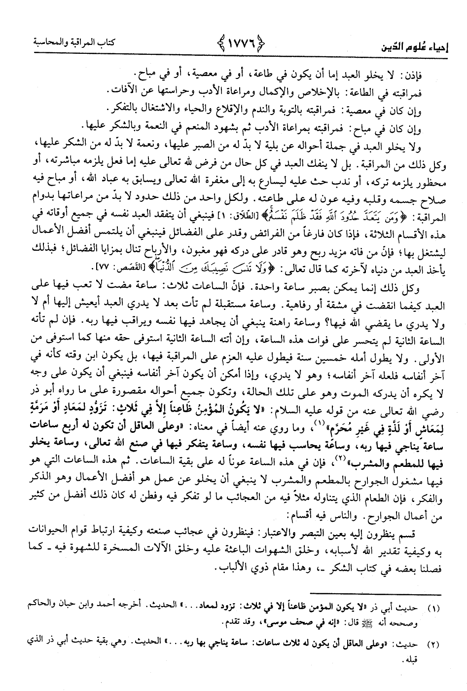 2 - حَدِيث "وَعَلَى الْعَاقِل أَن يكون لَهُ أَربع سَاعَات: سَاعَة يُنَاجِي فِيهَا ربه وَسَاعَة يُحَاسب فِيهَا نَفسه وَسَاعَة يتفكر فِيهَا فِي صنع الله تَعَالَى وَسَاعَة يَخْلُو فِيهَا للمطعم وَالْمشْرَب"