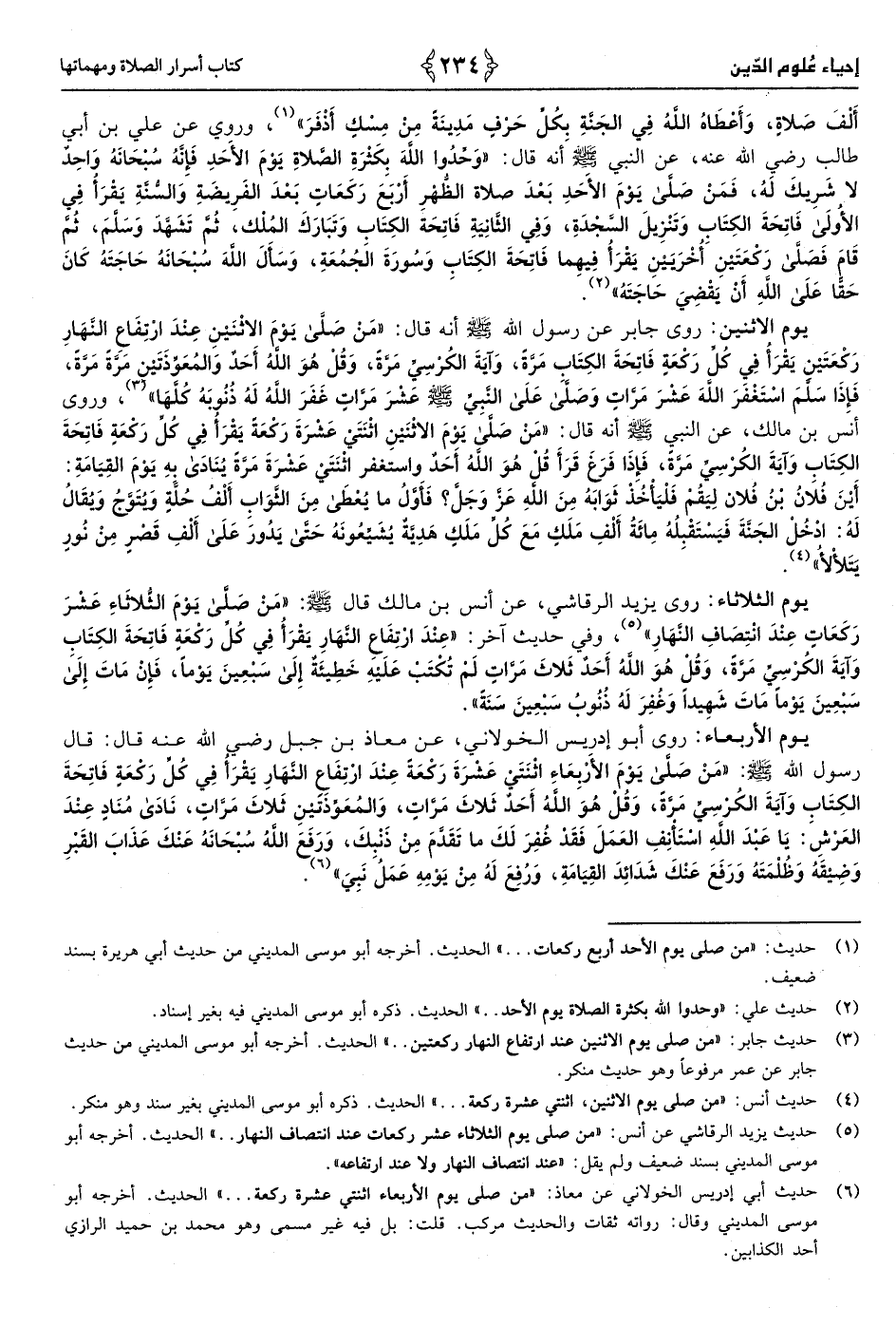 6 - حَدِيث عَلّي «وحدوا الله بِكَثْرَة الصَّلَاة يَوْم الْأَحَد فَإِنَّهُ سُبْحَانَهُ وَاحِد لَا شريك لَهُ فَمن صَلَّى يَوْم الْأَحَد بعد صَلَاة الظّهْر أَربع رَكْعَات بعد الْفَرِيضَة وَالسّنة يقْرَأ فِي الأولَى فَاتِحَة الْكتاب وتنزيل السَّجْدَة، وَفِي الثَّانِيَة فَاتِحَة الْكتاب وتبارك الْملك ثمَّ تشهد وَسلم ثمَّ قَامَ فَصَلى رَكْعَتَيْنِ أُخْرَيَيْنِ يقْرَأ فيهمَا فَاتِحَة الْكتاب وَسورَة الْجُمُعَة وَسَأَلَ الله سُبْحَانَهُ حَاجته كَانَ حَقًا عَلَى الله أَن يقْضِي حَاجته»