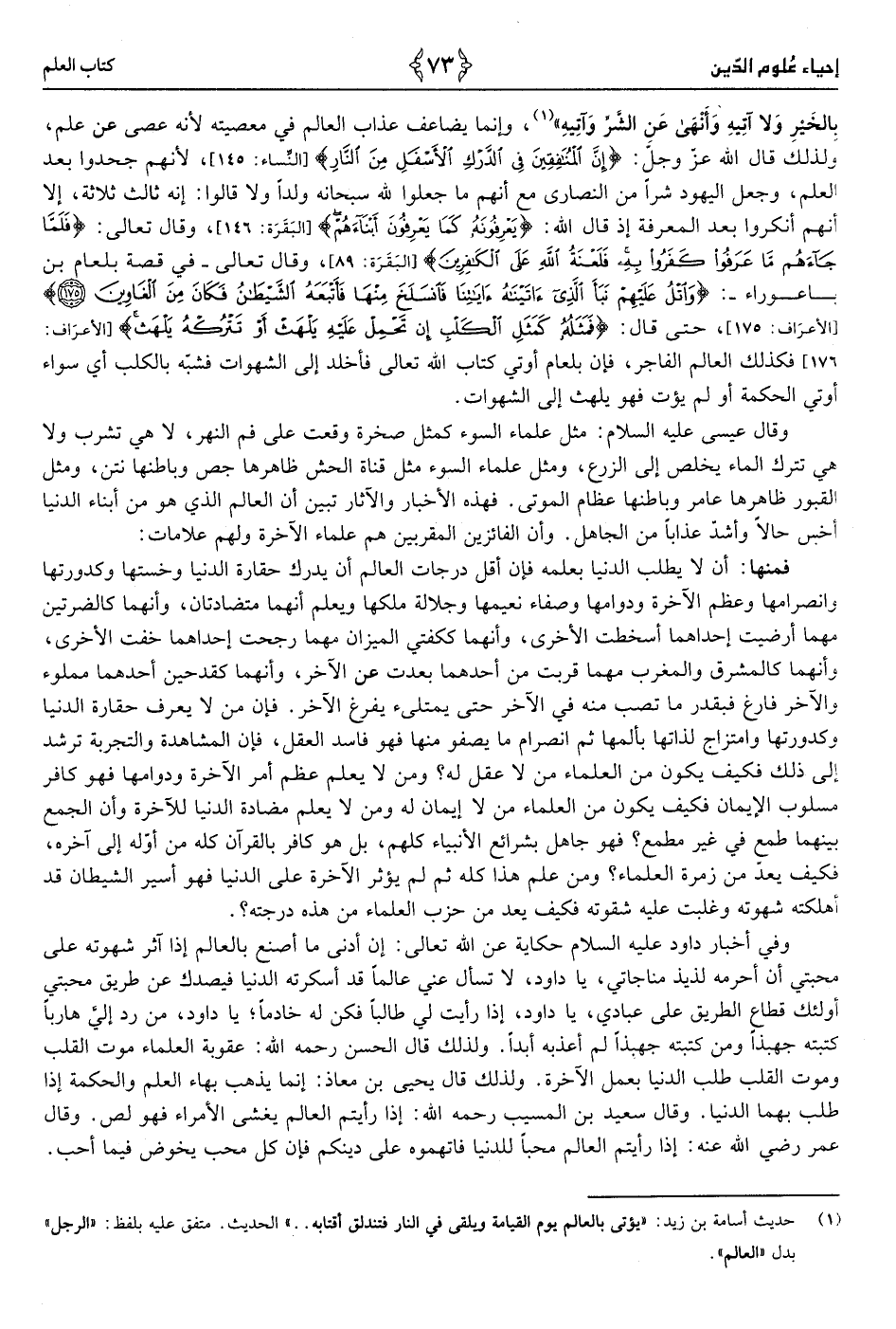 2 - حَدِيث أُسَامَة بن زيد "يُؤْتَى بالعالم يَوْم الْقِيَامَة ويلقى فِي النَّار فتندلق أقتابه فيدور بهَا كَمَا يَدُور الْحمار بالرحى فيطيف بِهِ أهل النَّار فَيَقُولُونَ: مَا لَك؟ فَيَقُول: كنت آمُر بِالْخَيرِ وَلَا آتِيَة، وأنهى عَن الشَّرّ وآتيه «