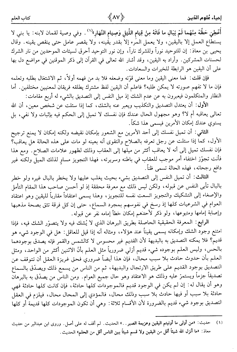 4 - حَدِيث «من أولَى مَا أُوتِيتُمْ الْيَقِين وعزيمة الصَّبْر ... الحَدِيث» وَفِي الْإِحْيَاء "إِن من أقل مَا أُوتِيتُمْ: الْيَقِين وعزيمة الصَّبْر وَمن أعطي حَظه مِنْهُمَا لم يبال مَا فَاتَهُ من قيام اللَّيْل وَصِيَام النَّهَار «