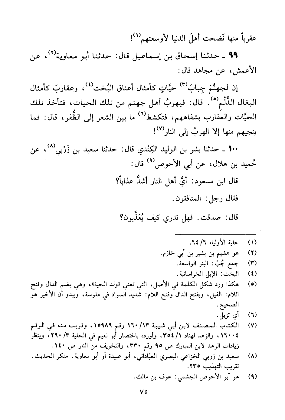 100 - حَدَّثَنَا بِشْرُ بْنُ الْوَلِيدِ الْكِنْدِيُّ، قَالَ: حَدَّثَنَا سَعِيدُ بْنُ زَرْبِيٍّ، عَنْ حُمَيْدِ بْنِ هِلَالٍ، عَنْ أَبِي الْأَحْوَصِ، قَالَ: قَالَ ابْنُ مَسْعُودٍ: «§أيُّ أَهْلِ النَّارِ أَشَدُّ عَذَابًا؟» فَقَالَ رَجُلٌ: الْمُنَافِقُونَ، قَالَ: «صَدَقْتَ. فَهَلْ تَدْرِي كَيْفَ يُعَذَّبُونَ؟» -[76]- قَالَ: لَا. قَالَ: «يُجْعَلُونَ فِي تَوَابِيتَ مِنْ حَدِيدٍ تُصْمَدُ عَلَيْهِمْ، ثُمَّ يُجْعَلُونَ فِي الدَّرَكِ الْأَسْفَلِ مِنَ النَّارِ فِي تَنَانِيرَ أَضْيَقَ مِنْ زُجٍّ يُقَالُ لَهُ جُبُّ الْحُزْنِ، تُطْبَقُ عَلَى أَقْوَامٍ بِأَعْمَالِهِمْ آخِرَ الْأَبَدِ»