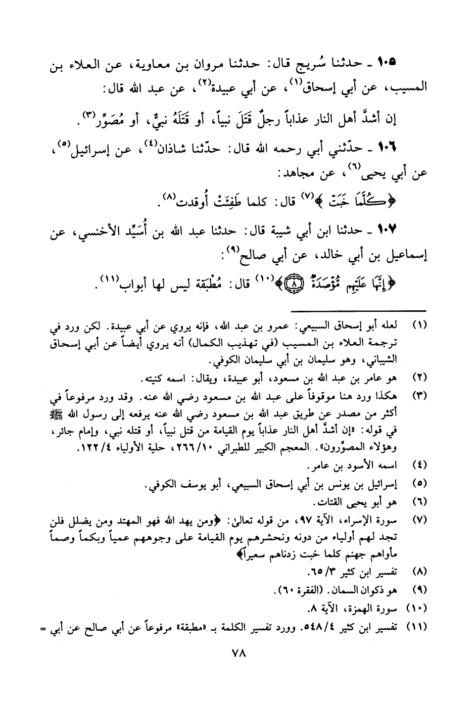105 - حَدَّثَنَا سُرَيْجٌ، قَالَ: حَدَّثَنَا مَرْوَانُ بْنُ مُعَاوِيَةَ، عَنِ الْعَلَاءِ بْنِ الْمُسَيَّبِ، عَنْ أَبِي إِسْحَاقَ، عَنْ أبي عبيدة , عَنْ عَبْدِ اللَّهِ، قَالَ: «إِنَّ §أَشَدَّ أَهْلِ النَّارِ عَذَابًا رَجُلٌ قَتَلَ نَبِيًّا، أَوْ قَتَلَهُ نَبِيٌّ، أَوْ مُصَوِّرٌ»