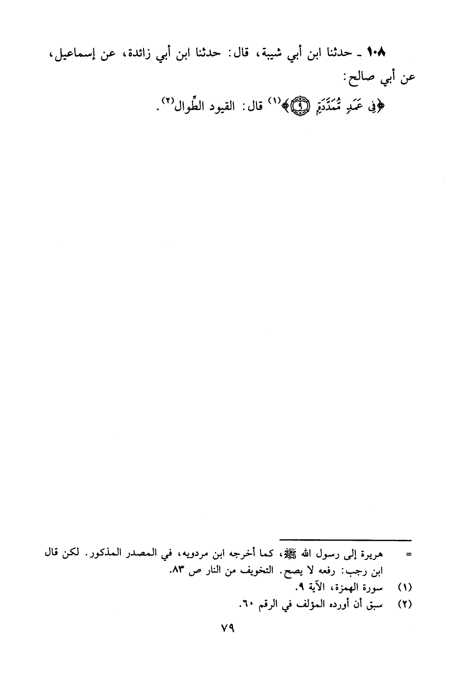 108 - حَدَّثَنَا ابْنُ أَبِي شَيْبَةَ، قال: حَدَّثَنَا ابْنُ أَبِي زَائِدٍة، عَنْ إِسْمَاعِيلَ، عَنْ أَبِي صَالِحٍ: {§فِي عَمَدٍ مُمَدَّدَةٍ} [الهمزة: 9] قَالَ: «الْقُيُودُ الطِّوَالُ»
