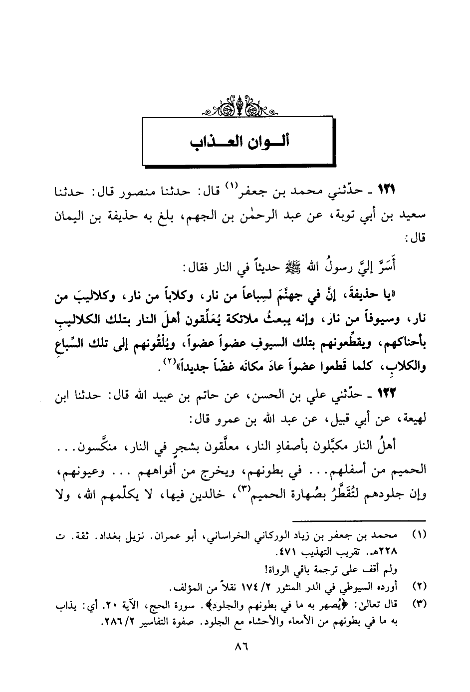 121 - حَدَّثَنِي مُحَمَّدُ بْنُ جَعْفَرٍ، قَالَ: حَدَّثَنَا مَنْصُورٌ، قَالَ: حَدَّثَنَا سَعِيدُ بْنُ أَبِي تَوْبَةَ، عَنْ عَبْدِ الرَّحْمَنِ بْنِ الْجَهْمِ، بَلَغَ بِهِ حُذَيْفَةَ بْنَ الَيَمَانِ، قَالَ: أَسَرَّ إِلَيَّ رَسُولُ اللَّهِ صَلَّى اللهُ عَلَيْهِ وَسَلَّمَ حَدِيثًا فِي النَّارِ، فَقَالَ: «يَا حُذَيْفَةُ، إِنَّ §فِي جَهَنَّمَ لَسِبَاعًا مِنْ نَارٍ، وَكِلَابًا مِنْ نَارٍ، وَكَلَالَيبَ مِنْ نَارٍ، وَسُيُوفًا مِنْ نَارٍ، وَإِنَّهُ يُبْعَثُ مَلَائِكَةٌ يُعَلِّقُونَ أَهْلَ النَّارِ بِتِلْكَ الْكَلَالِيبِ بِأَحْنَاكِهِمْ، وَيُقَطِّعُونَهُمْ بِتِلْكَ السُّيُوفِ عُضْوًا عُضْوًا، وَيُلْقُونَهُمْ إِلَى تِلْكَ السِّبَاعِ وَالْكِلَابِ، كُلَّمَا قَطَعُوا عُضْوًا عَادَ مَكَانَهُ غضْا جَدِيدًا»