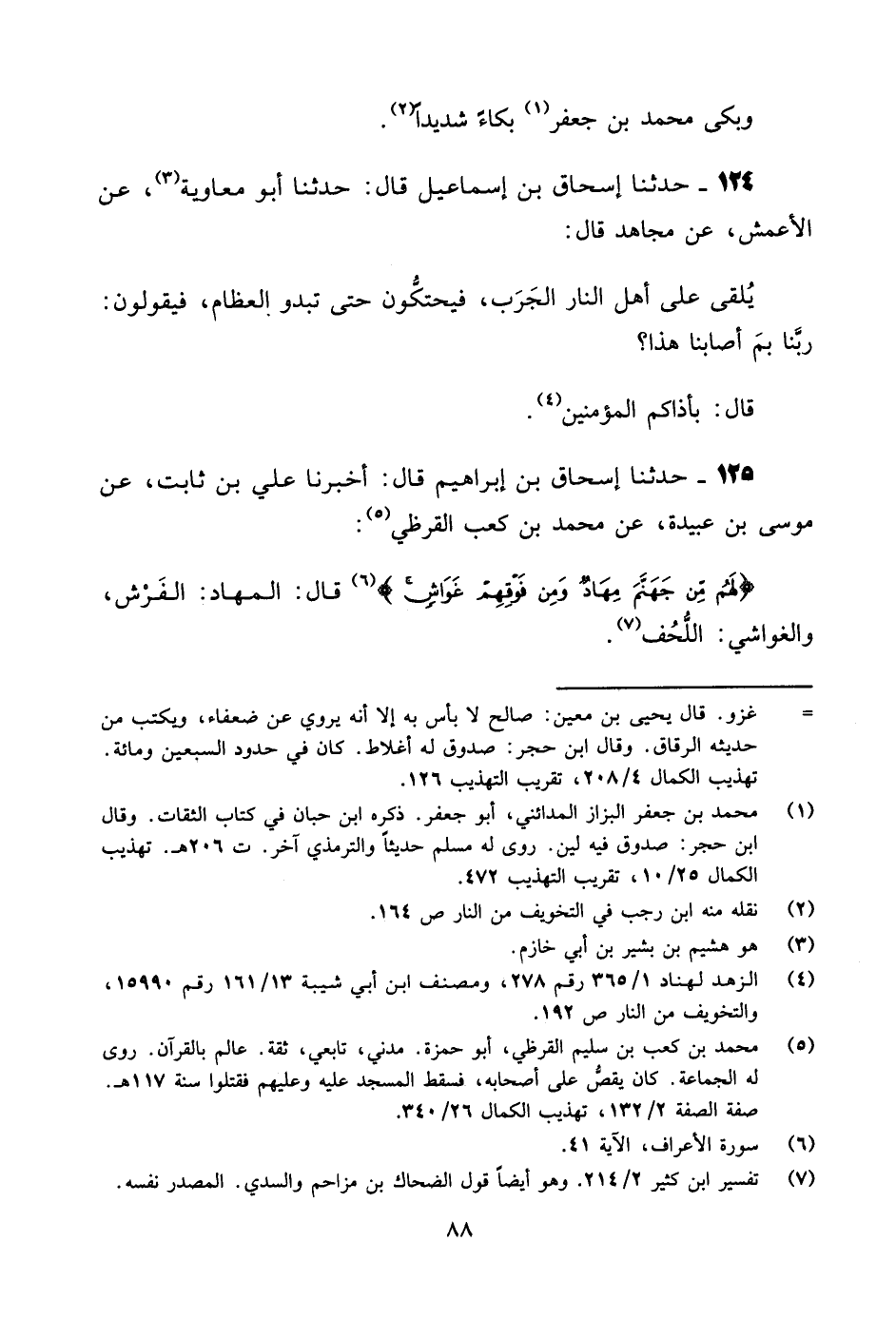 124 - حَدَّثَنَا إِسْحَاقُ بْنُ إِسْمَاعِيلَ، قَالَ: حَدَّثَنَا أَبُو مُعَاوِيَةَ، عَنِ الْأَعْمَشِ، عَنْ مُجَاهِدٍ، قَالَ: " §يُلْقَى عَلَى أَهْلِ النَّارِ الْجَرَبُ، فَيَحْتَكُّونَ حَتَّى تَبْدُوَ الْعِظَامُ، فَيَقُولُونَ: رَبَّنَا بِمَ أَصَابَنَا هَذَا؟ قَالَ: بِأَذَاكُمُ الْمُؤْمِنِينَ "