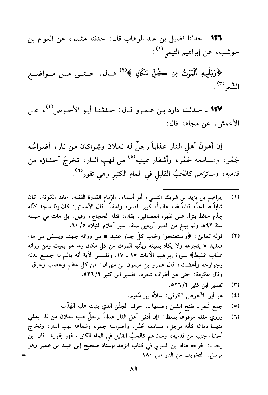 127 - حَدَّثَنَا دَاوُدُ بْنُ عَمْرٍو، قَالَ: حَدَّثَنَا أَبُو الْأَحْوَصِ، عَنِ الْأَعْمَشِ، عَنْ مُجَاهِدٍ، قَالَ: «إِنَّ §أَهْوَنَ أَهْلِ النَّارِ عَذَابًا رَجُلٌ لَهُ نَعْلَانِ وَشِرَاكَانِ مِنْ نَارٍ، أَضْرَاسُهُ جَمْرٌ، وَمَسَامِعُهُ جَمْرٌ، وَأَشْفَارُ عَيْنَيْهِ مِنْ لَهَبِ النَّارِ، تَخْرُجُ أَحْشَاؤُهُ مِنْ قَدَمَيْهِ، وَسَائِرُهُمْ كَالْحَبِّ الْقَلِيلِ فِي الْمَاءِ الْكَثِيرِ وَهِيَ تَفُورُ»