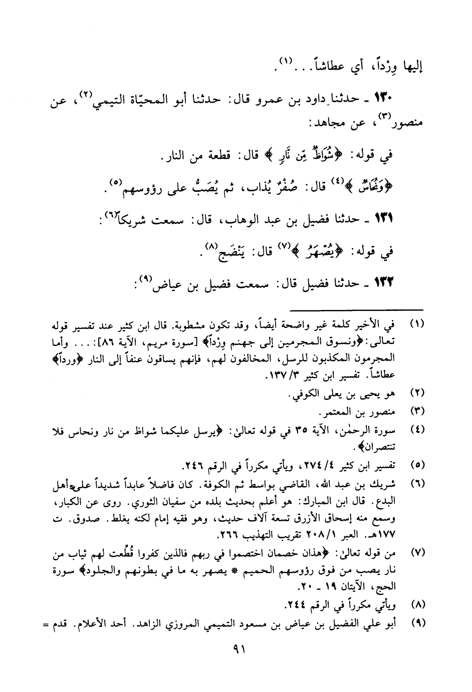 130 - حَدَّثَنَا دَاوُدُ بْنُ عَمْرٍو، قَالَ: حَدَّثَنَا أَبُو الْمُحَيَّاةِ التَّيْمِيُّ، عَنْ مَنْصُورٍ، عَنْ مُجَاهِدٍ، فِي قَوْلِهِ: {§شُوَاظٌ مِنْ نَارٍ} [الرحمن: 35] قَالَ: «قِطْعَةٌ مِنْ نَارٍ» {وَنُحَاسٌ} [الرحمن: 35] قَالَ: «صُفْرٌ يُذَابُ، ثُمَّ يُصَبُّ عَلَى رُءُوسِهِمْ»
