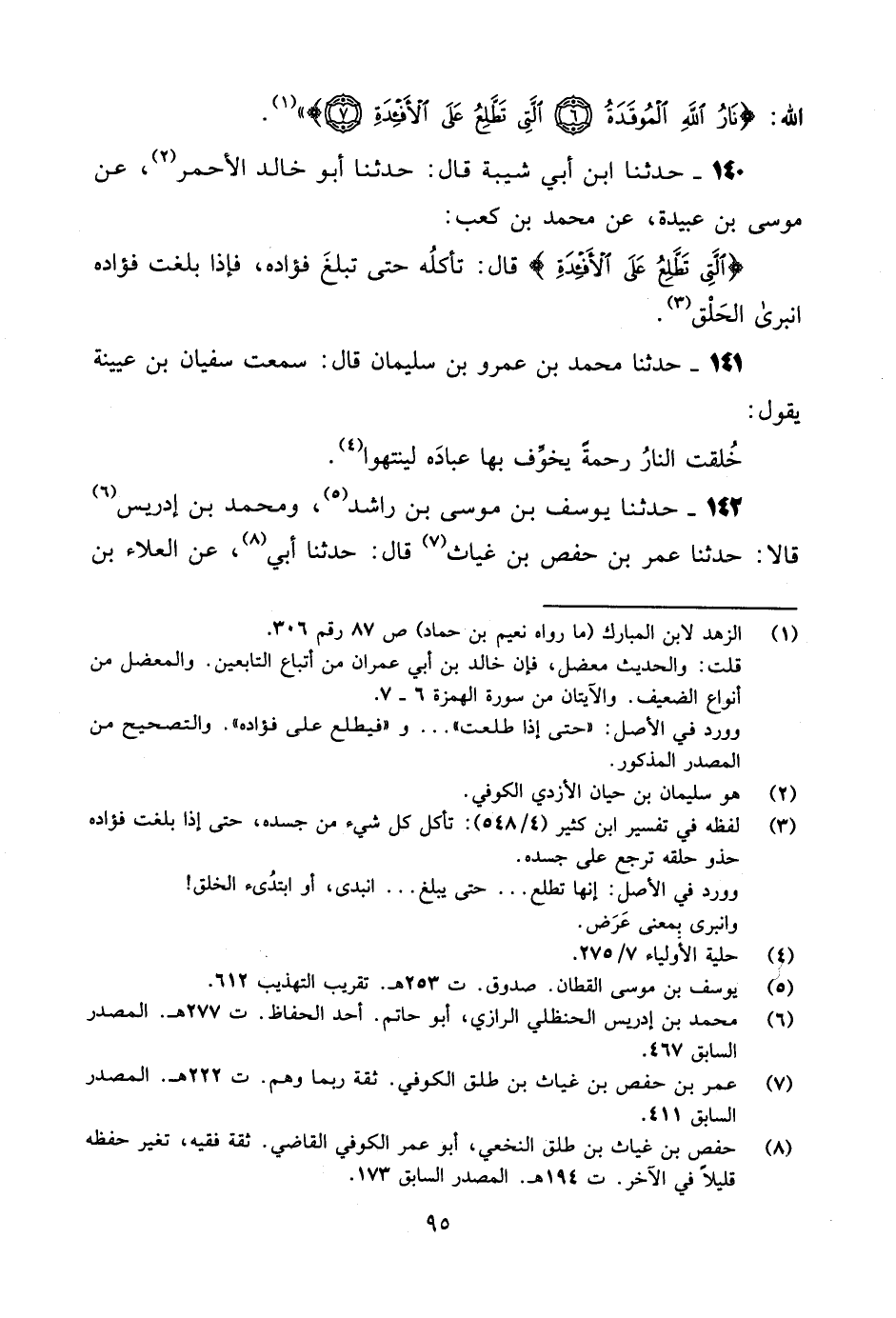 140 - حَدَّثَنَا ابْنُ أَبِي شَيْبَةَ، قَالَ: حَدَّثَنَا أَبُو خَالِدٍ الْأَحْمَرُ، عَنْ مُوسَى بْنِ عُبَيْدَةَ، عَنْ مُحَمَّدِ بْنِ كَعْبٍ: {§الَّتِي تَطَّلِعُ عَلَى الْأَفْئِدَةِ} [الهمزة: 7] قَالَ: «تَأْكُلُهُ حَتَّى تبلغ فُؤَادَهُ، فَإِذَا بَلَغَتْ فُؤَادَهُ انْبَرَى الْحَلْقُ»