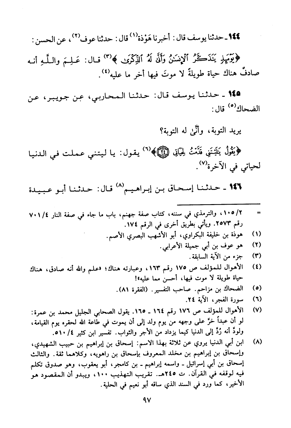 144 - حَدَّثَنَا يُوسُفُ، قَالَ: أَخْبَرَنَا هَوْذَةُ، قَالَ: حَدَّثَنَا عَوْفٌ، عَنِ الْحَسَنِ: {§يَوْمَئِذٍ يَتَذَكَّرُ الِإِنْسَانُ وَأَنَّى لَهُ الذِّكْرَى} [الفجر: 23] قَالَ: «عَلِمَ وَاللَّهِ أَنَّهُ صَادَفَ هُنَاكَ حَيَاةً طَوِيلَةً لَا مَوْتَ فِيهَا آخِرَ مَا عَلَيْهِ»