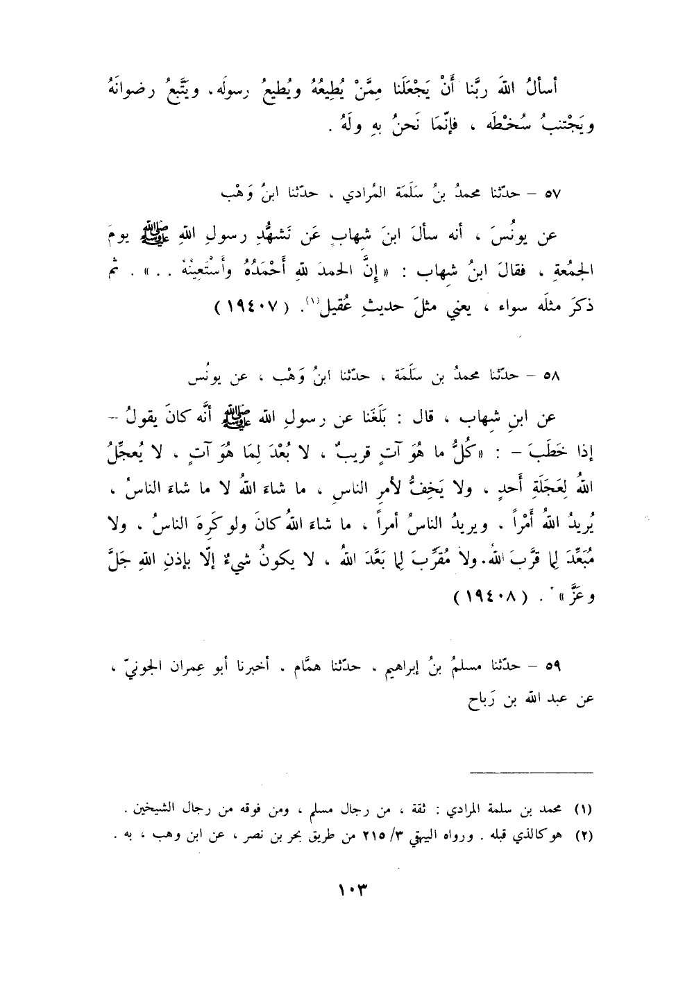 58 - حَدَّثَنَا مُحَمَّدُ بْنُ سَلَمَةَ، حَدَّثَنَا ابْنُ وَهْبٍ، عَنْ يُونُسَ، عَنِ ابْنِ شِهَابٍ، قَالَ: بَلَغَنَا عَنْ رَسُولِ اللَّهِ صَلَّى اللهُ عَلَيْهِ وَسَلَّمَ أَنَّهُ كَانَ يَقُولُ - إِذَا خَطَبَ -: «§كُلُّ مَا هُوَ آتٍ قَرِيبٌ، لَا بُعْدَ لِمَا هُوَ آتٍ، لَا يُعَجِّلُ اللَّهُ لِعَجَلَةِ أَحَدٍ وَلَا يَخِفُّ لِأَمْرِ النَّاسِ، مَا شَاءَ اللَّهُ لَا مَا شَاءَ النَّاسُ، يُرِيدُ اللَّهُ أَمْرًا وَيُرِيدُ النَّاسُ أَمْرًا، مَا شَاءَ اللَّهُ كَانَ وَلَوْ كَرِهَ النَّاسُ، وَلَا مُبَعِّدَ لَمَّا قَرَّبَ اللَّهُ وَلَا مُقَرَّبَ لِمَا بَعَّدَ اللَّهُ، لَا يَكُونُ شَيْءٌ إِلَّا بِإِذْنِ اللَّهِ جَلَّ وَعَزَّ»