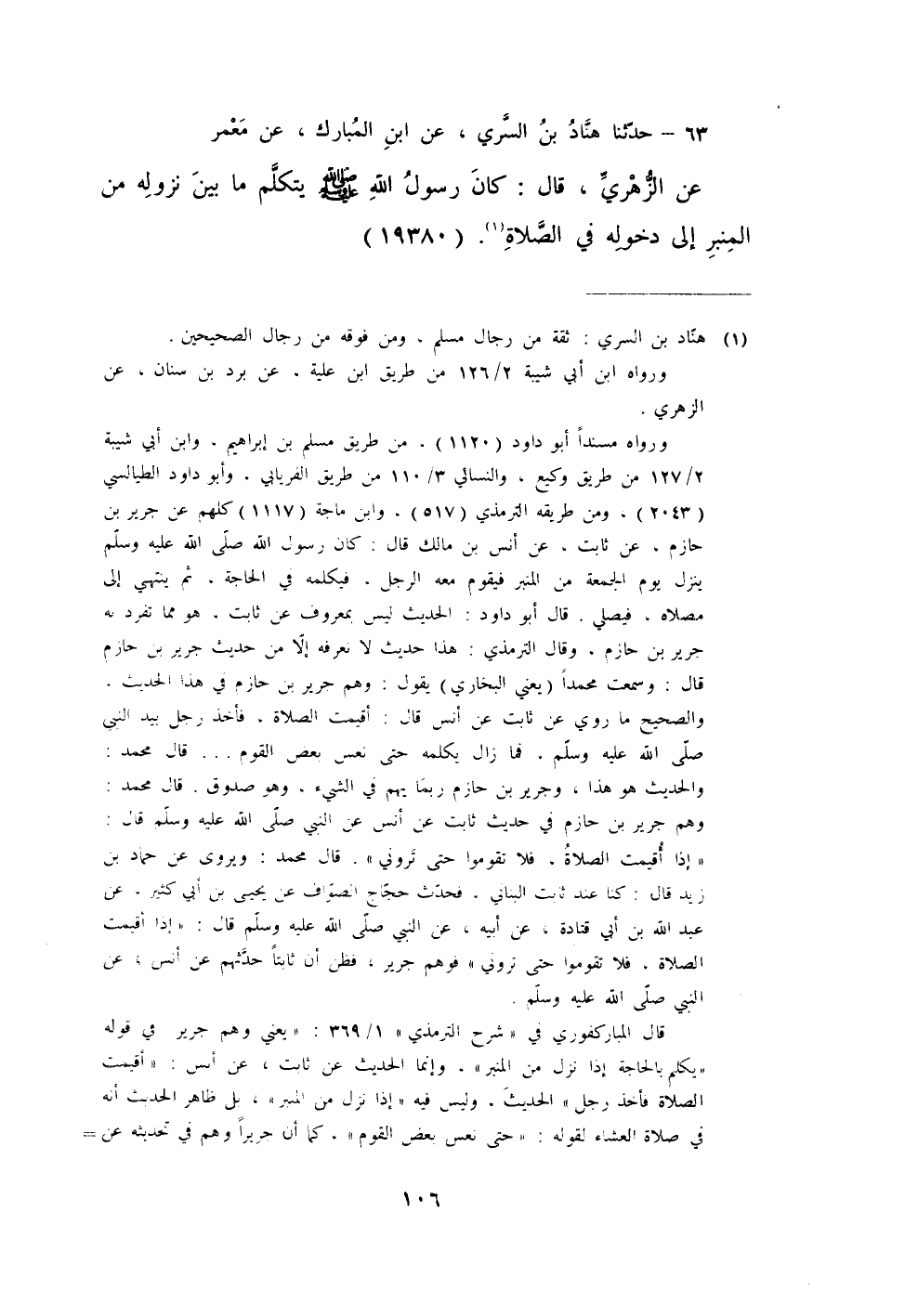 63 - حَدَّثَنَا هَنَّادُ بْنُ السَّرِيِّ، عَنِ ابْنِ الْمُبَارَكِ، عَنْ مَعْمَرٍ، عَنِ الزُّهْرِيِّ، قَالَ: «كَانَ رَسُولُ اللَّهِ صَلَّى اللهُ عَلَيْهِ وَسَلَّمَ §يَتَكَلَّمُ مَا بَيْنَ نُزُولِهِ مِنَ الْمِنْبَرِ إِلَى دُخُولِهِ فِي الصَّلَاةِ» -[107]- قَالَ أَبُو دَاوُدَ: قَدْ رُوِيَ هَذَا مُسْنِدًا، وَلَيْسَ هُوَ بِالْقَوِيِّ وَلَا يَصِحُّ