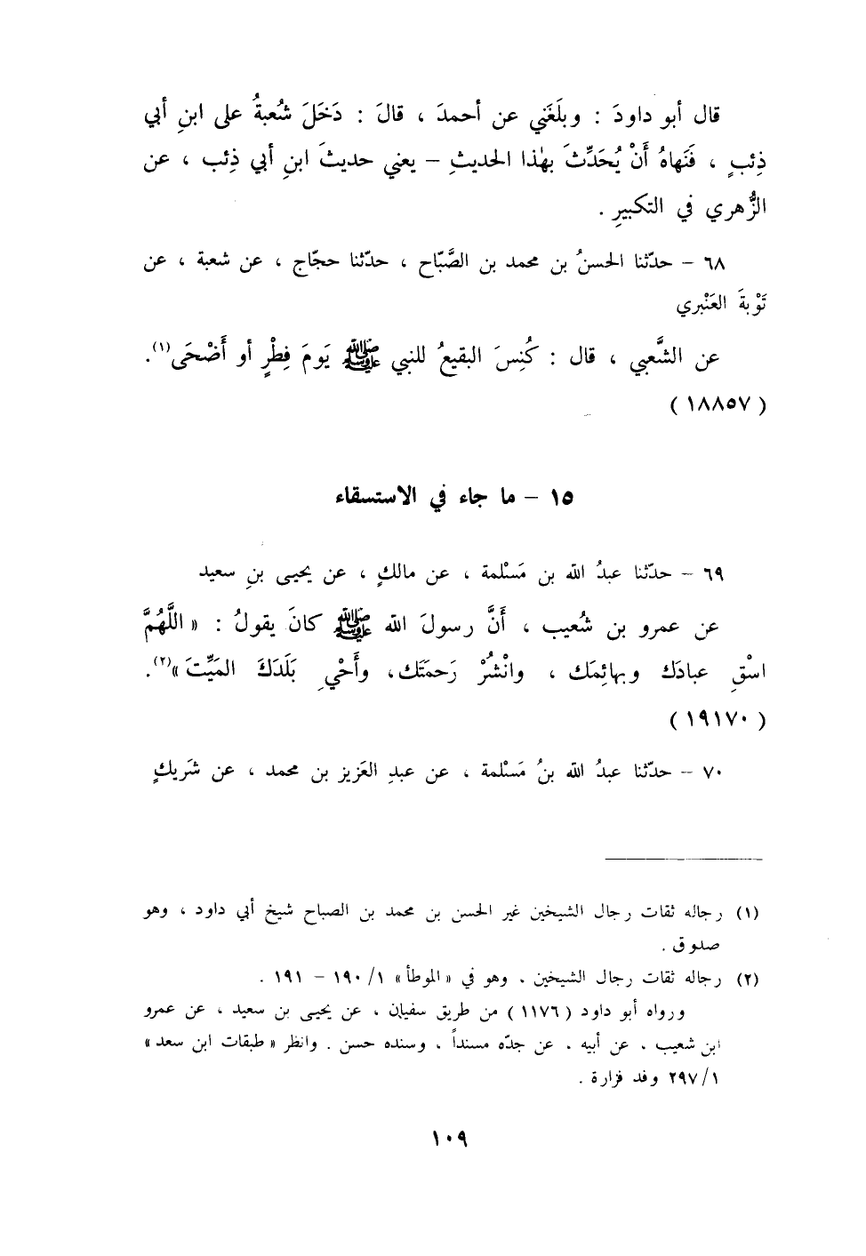 68 - حَدَّثَنَا الْحَسَنُ بْنُ مُحَمَّدِ بْنِ الصَّبَّاحِ، حَدَّثَنَا حَجَّاجٌ، عَنْ شُعْبَةَ، عَنْ تَوْبَةَ الْعَنْبَرِيِّ، عَنِ الشَّعْبِيِّ، قَالَ: «§كُنِسَ الْبَقِيعُ لِلنَّبِيِّ صَلَّى اللهُ عَلَيْهِ وَسَلَّمَ يَوْمَ فِطْرٍ أَوَ أَضْحًى»