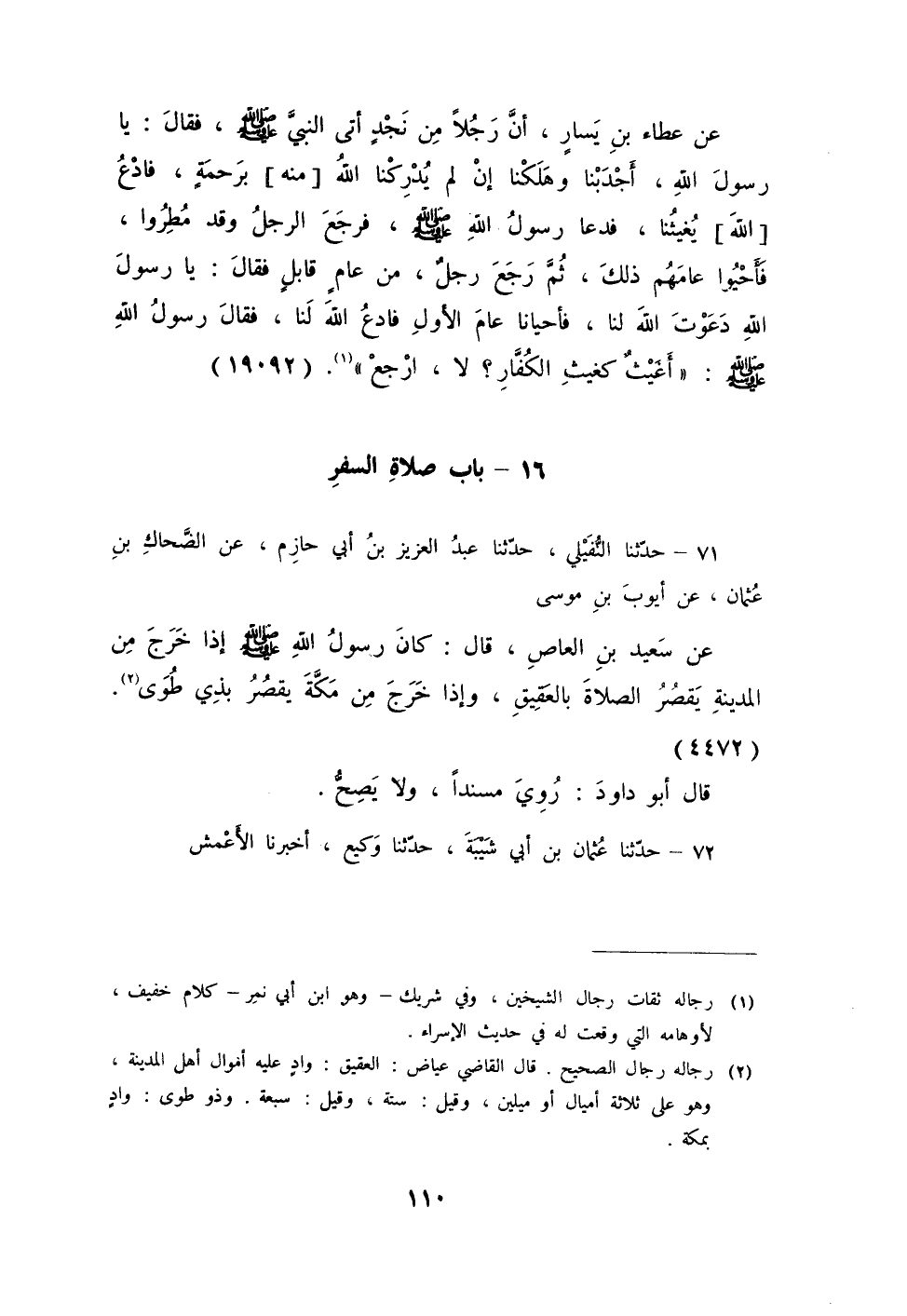 71 - حَدَّثَنَا النُّفَيْلِيُّ، حَدَّثَنَا عَبْدُ الْعَزِيزِ بْنُ أَبِي حَازِمٍ، عَنِ الضَّحَّاكِ بْنِ عُثْمَانَ، عَنْ أَيُّوبَ بْنِ مُوسَى، عَنْ سَعِيدِ بْنِ الْعَاصِ، قَالَ: «كَانَ رَسُولُ اللَّهِ صَلَّى اللهُ عَلَيْهِ وَسَلَّمَ إِذَا خَرَجَ مِنَ الْمَدِينَةِ §يَقْصُرُ الصَّلَاةَ بِالْعَقِيقِ، وَإِذَا خَرَجَ مِنْ مَكَّةَ يَقْصُرُ بِذِي طُوًى» قَالَ أَبُو دَاوُدَ: رُوِيَ مُسْنَدًا، وَلَا يَصِحُّ