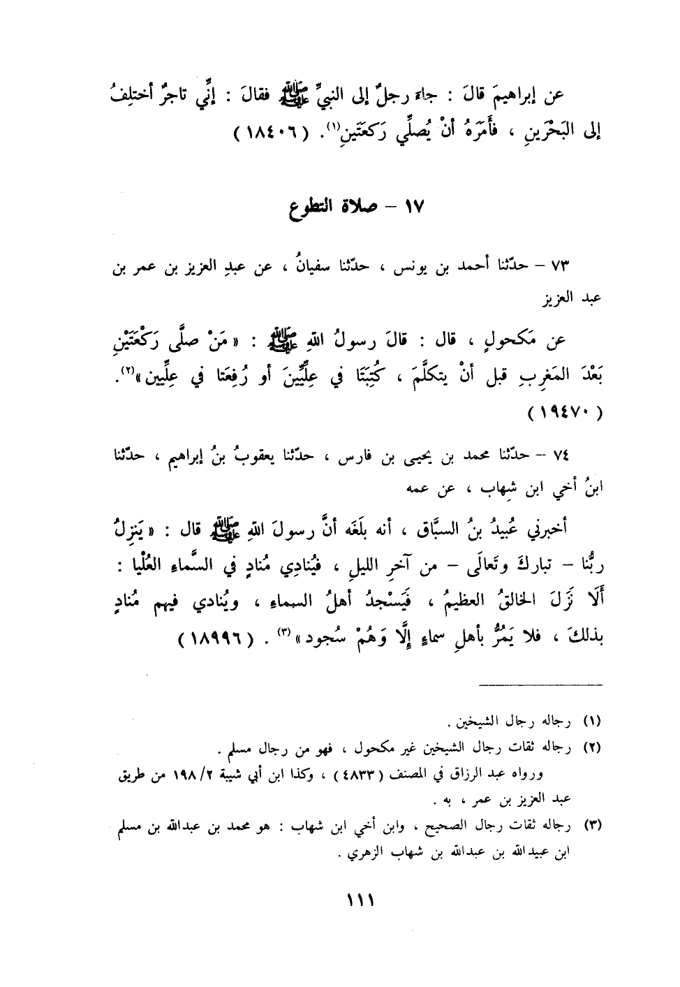 73 - حَدَّثَنَا أَحْمَدُ بْنُ يُونُسَ، حَدَّثَنَا سُفْيَانُ، عَنْ عَبْدِ الْعَزِيزِ بْنِ عُمَرَ بْنِ عَبْدِ الْعَزِيزِ، عَنْ مَكْحُولٍ، قَالَ: قَالَ رَسُولُ اللَّهِ صَلَّى اللهُ عَلَيْهِ وَسَلَّمَ: «§مَنْ صَلَّى رَكْعَتَيْنِ بَعْدَ الْمَغْرِبِ قَبْلَ أَنْ يَتَكَلَّمَ كُتِبَتَا فِي عِلِّيِّينَ أَوْ رُفِعَتَا فِي عِلِّيِّينَ»