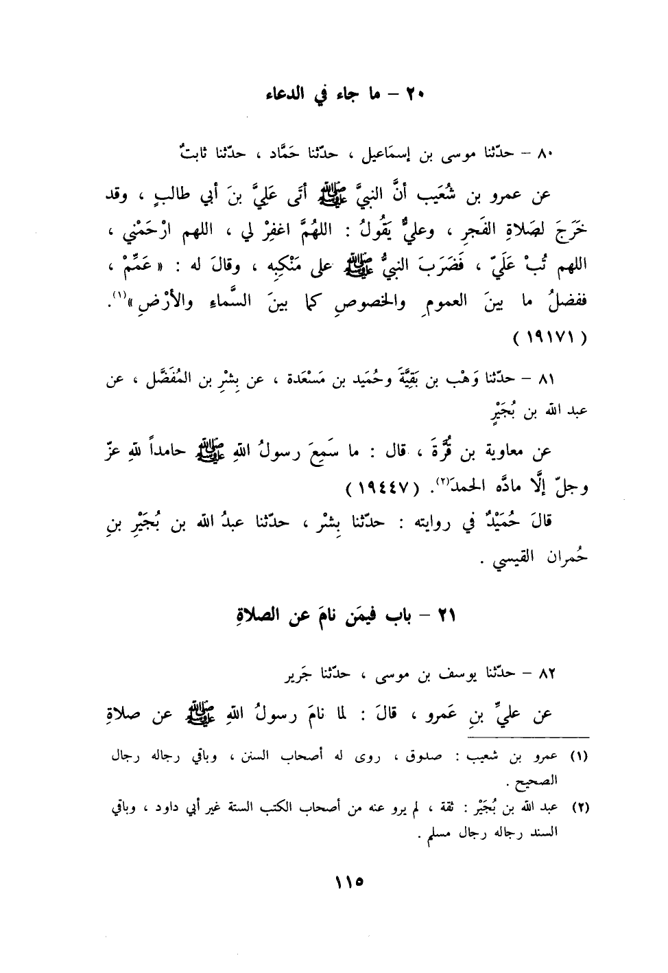 80 - حَدَّثَنَا مُوسَى بْنُ إِسْمَاعِيلَ، حَدَّثَنَا حَمَّادٌ، حَدَّثَنَا ثَابِتٌ، عَنْ عَمْرِو بْنِ شُعَيْبٍ، أَنَّ النَّبِيَّ صَلَّى اللهُ عَلَيْهِ وَسَلَّمَ أَتَى عَلِيَّ بْنَ أَبِي طَالِبٍ وَقَدْ خَرَجَ لِصَلَاةِ الْفَجْرِ وَعَلِيٌّ يَقُولُ: اللَّهُمَّ اغْفِرْ لِي، اللَّهُمَّ ارْحَمْنِي، اللَّهُمَّ تُبْ عَلَيَّ فَضَرَبَ النَّبِيُّ صَلَّى اللهُ عَلَيْهِ وَسَلَّمَ عَلَى مَنْكِبِهِ، وَقَالَ: لَهُ: «§عَمِّمْ فَفَضْلُ مَا بَيْنَ الْعُمُومِ وَالْخُصُوصِ كَمَا بَيْنَ السَّمَاءِ وَالْأَرْضِ»