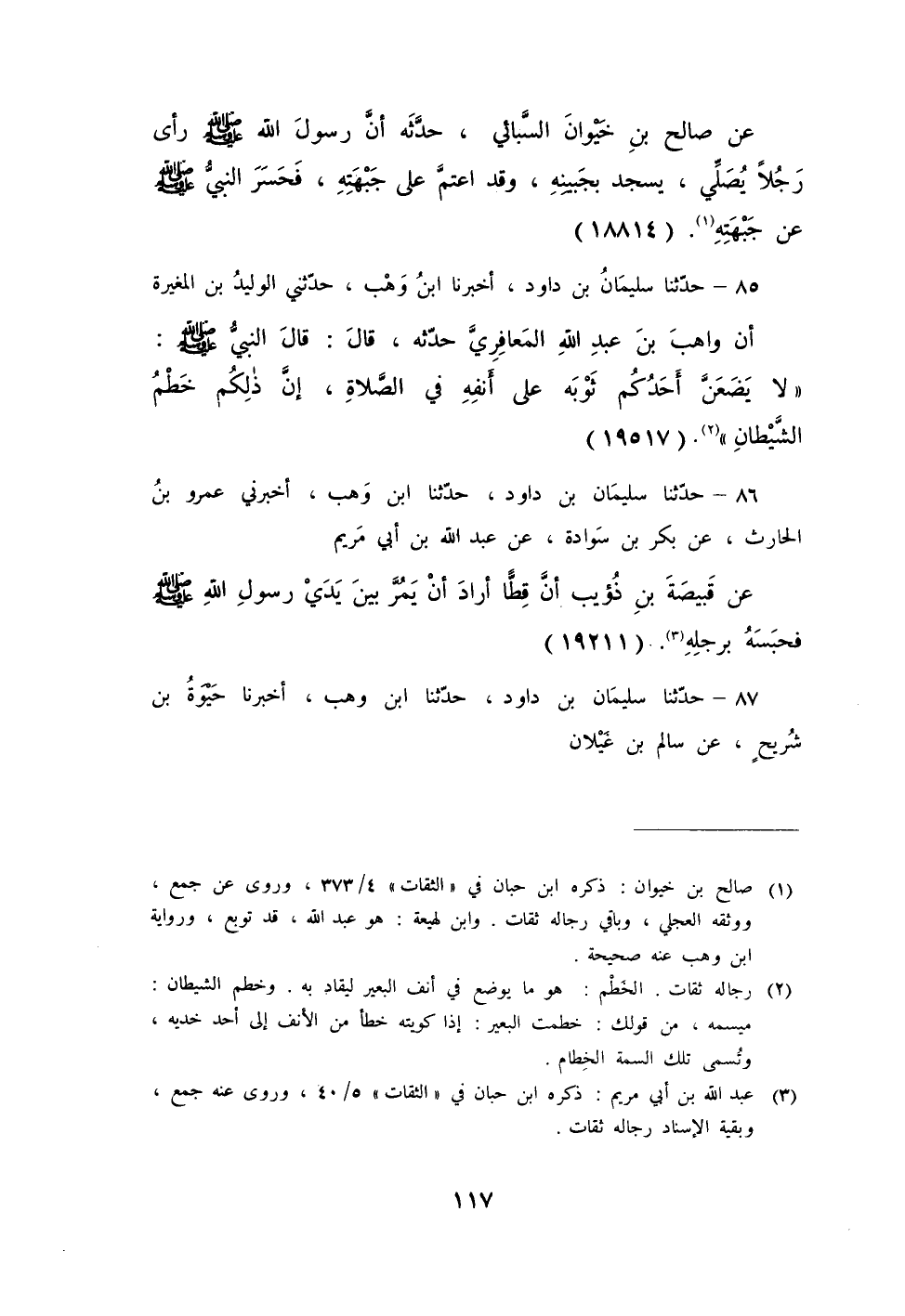 85 - حَدَّثَنَا سُلَيْمَانُ بْنُ دَاوُدَ، أَخْبَرَنَا ابْنُ وَهْبٍ، حَدَّثَنِي الْوَلِيدُ بْنُ الْمُغِيرَةِ، أَنَّ وَاهِبَ بْنَ عَبْدِ اللَّهِ الْمَعَافِرِيَّ حَدَّثَهُ قَالَ: قَالَ النَّبِيُّ صَلَّى اللهُ عَلَيْهِ وَسَلَّمَ: «§لَا يَضَعَنَّ أَحَدُكُمْ ثَوْبَهُ عَلَى أَنْفِهِ فِي الصَّلَاةِ، إِنَّ ذَلِكُمْ خَطْمُ الشَّيْطَانِ»