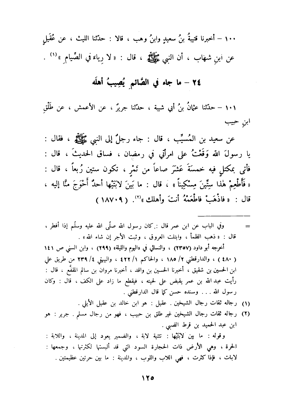 101 - حَدَّثَنَا عُثْمَانُ بْنُ أَبِي شَيْبَةَ، حَدَّثَنَا جَرِيرٌ، عَنِ الْأَعْمَشِ، عَنْ طَلْقِ بْنِ حَبِيبٍ، عَنْ سَعِيدِ بْنِ الْمُسَيِّبِ، قَالَ: جَاءَ رَجُلٌ إِلَى النَّبِيِّ صَلَّى اللهُ عَلَيْهِ وَسَلَّمَ فَقَالَ: يَا رَسُولَ اللَّهِ §وَقَعَتْ عَلَى امْرَأَتِي فِي رَمَضَانَ، فَسَاقَ الْحَدِيثَ قَالَ: فَأَتَى بِمِكْتَلٍ فِيهِ خَمْسَةَ عَشَرَ صَاعًا مِنْ تَمْرٍ تَكُونُ سِتِّينَ رُبْعًا قَالَ: «فَأَطْعِمْ هَذَا سِتِّينَ مِسْكِينًا» قَالَ: مَا بَيْنَ لَابَتَيْهَا أَحَدٌ أَحْوَجُ مِنَّا إِلَيْهِ قَالَ: «فَاذْهَبْ فَاطْعَمْهُ أَنْتَ وَأَهْلُكَ»