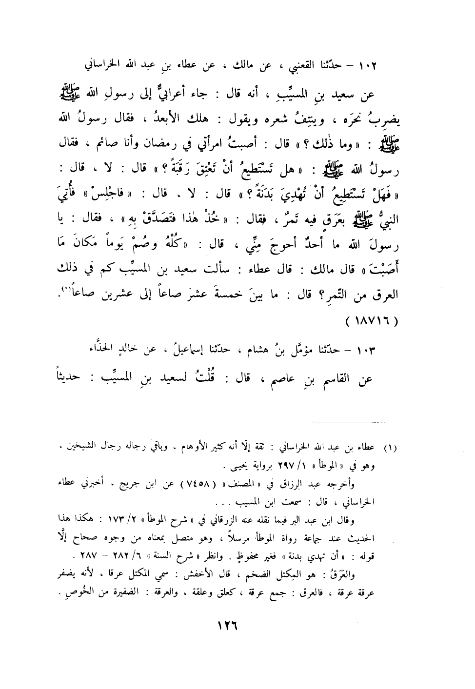 102 - حَدَّثَنَا الْقَعْنَبِيُّ، عَنْ مَالِكٍ، عَنْ عَطَاءِ بْنِ عَبْدِ اللَّهِ الْخُرَاسَانِيِّ، عَنْ سَعِيدِ بْنِ الْمُسَيِّبِ، أَنَّهُ قَالَ: جَاءَ أَعْرَابِيٌّ إِلَى رَسُولِ اللَّهِ صَلَّى اللهُ عَلَيْهِ وَسَلَّمَ يَضْرِبُ نَحْرَهُ وَيَنْتِفُ شَعْرَهُ وَيَقُولُ: هَلَكَ الْأَبْعَدُ، فَقَالَ رَسُولُ اللَّهِ صَلَّى اللهُ عَلَيْهِ وَسَلَّمَ: «وَمَا ذَلِكَ» ، قَالَ: §أَصَبْتُ امْرَأَتِي فِي رَمَضَانَ وَأَنَا صَائِمٌ فَقَالَ رَسُولُ اللَّهِ صَلَّى اللهُ عَلَيْهِ وَسَلَّمَ: «هَلْ تَسْتَطِيعُ أَنْ تَعْتِقَ رَقَبَةً» ، قَالَ: لَا، قَالَ: «فَهَلْ تَسْتَطِيعَ أَنْ تَهْدِيَ بَدَنَةً» ، قَالَ: لَا، قَالَ: " فَاجْلِسْ فَأُتِيَ النَّبِيُّ صَلَّى اللهُ عَلَيْهِ وَسَلَّمَ بِعَرَقٍ فِيهِ تَمْرٌ فَقَالَ: «خُذْ هَذَا فَتَصَدَّقْ بِهِ» فَقَالَ: يَا رَسُولَ اللَّهِ مَا أَحَدٌ أَحْوَجُ مِنِّي، قَالَ: «كُلْهُ وَصُمْ يَوْمًا مَكَانَ مَا أَصَبْتَ» قَالَ مَالِكٌ: قَالَ: عَطَاءٌ: سَأَلْتُ سَعِيدَ بْنَ الْمُسَيِّبِ كَمْ فِي ذَلِكَ الْعَرَقِ مِنَ التَّمْرِ قَالَ: مَا بَيْنَ خَمْسَةَ عَشَرَ صَاعًا إِلَى عِشْرِينَ صَاعًا