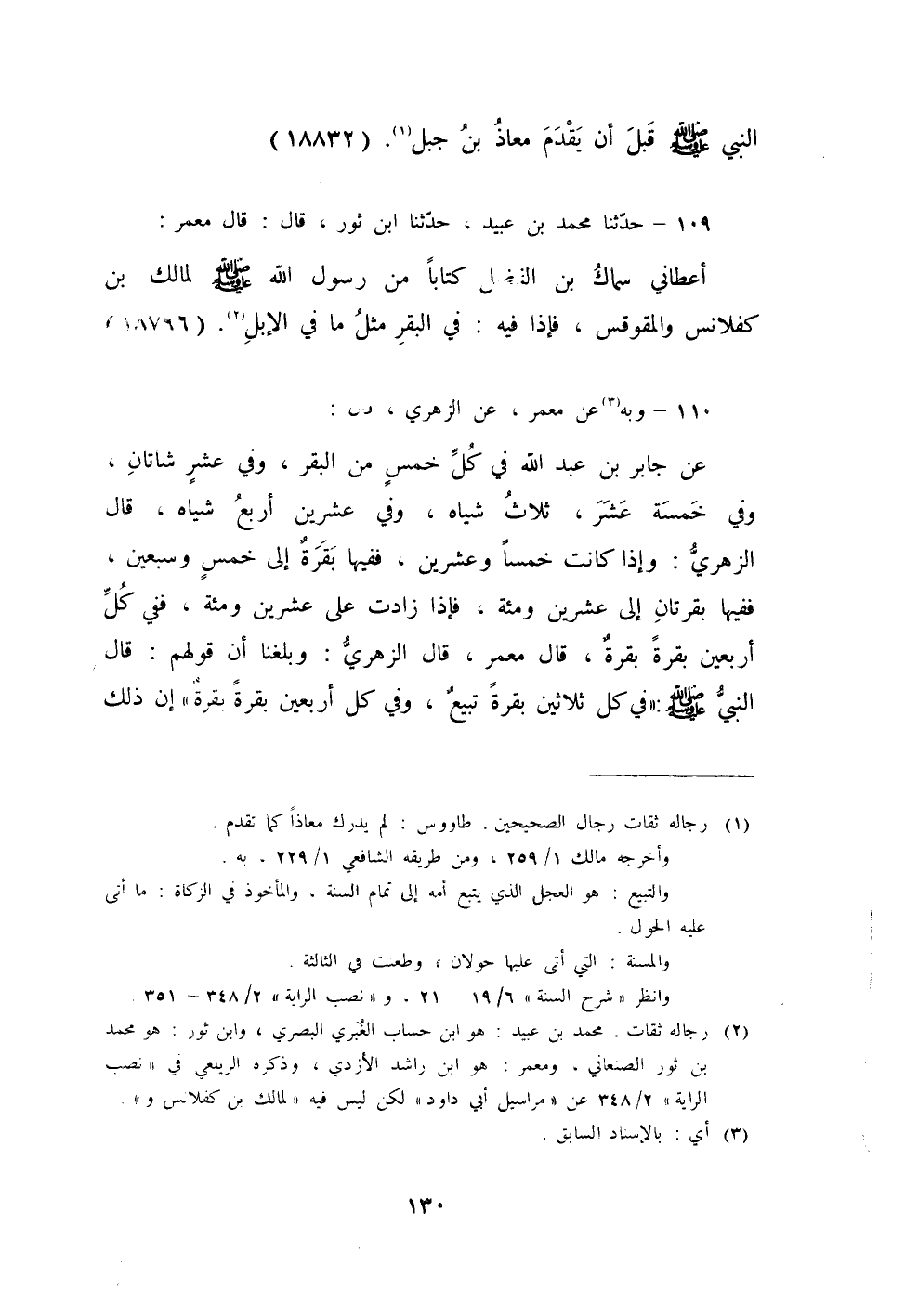 110 - وَبِهِ عَنْ مَعْمَرٍ، عَنِ الزُّهْرِيِّ، قَالَ: عَنْ جَابِرِ بْنِ عَبْدِ اللَّهِ، «§فِي كُلِّ خَمْسٍ مِنَ الْبَقَرِ وَفِي عَشَرٍ شَاتَانِ وَفِي خَمْسَةَ عَشَرَ ثَلَاثُ شِيَاهٍ وَفِي عِشْرِينَ أَرْبَعُ شِيَاهٍ» ، قَالَ: الزُّهْرِيُّ: وَإِذَا كَانَتْ خَمْسًا وَعِشْرِينَ فَفِيهَا بَقَرَةٌ إِلَى خَمْسٍ وَسَبْعِينَ فَفِيهَا بَقَرَتَانِ إِلَى عِشْرِينَ وَمِئَةٍ، فَإِذَا زَادَتْ عَلَى عِشْرِينَ وَمِئَةٍ فَفِي كُلِّ أَرْبَعِينَ بَقَرَةً بَقَرَةٌ، قَالَ: مَعْمَرٌ: قَالَ: الزُّهْرِيُّ: وَبَلَغَنَا أَنَّ قَوْلُهُمُ: قَالَ النَّبِيُّ صَلَّى اللهُ عَلَيْهِ وَسَلَّمَ: «فِي كُلِّ ثَلَاثِينَ بَقَرَةً تَبِيعٌ، وَفِي كُلِّ أَرْبَعِينَ بَقَرَةً بَقَرَةٌ» إِنَّ ذَلِكَ كَانَ تَخْفِيفًا لِأَهْلِ الْيَمَنِ ثُمَّ كَانَ هَذَا بَعْدَ ذَلِكَ