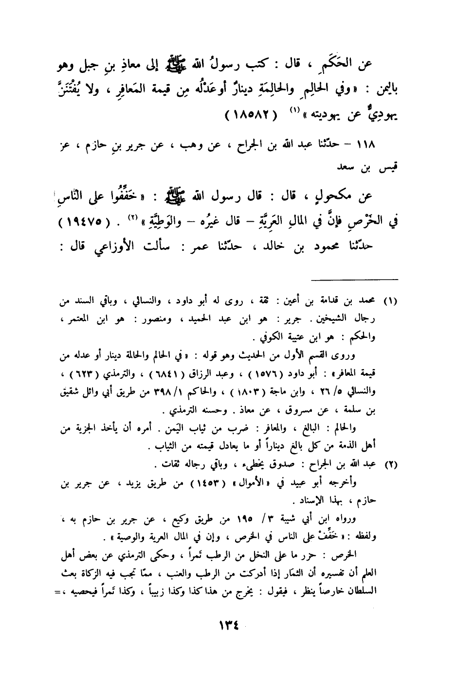 118 - حَدَّثَنَا عَبْدُ اللَّهِ بْنُ الْجَرَّاحِ، عَنْ وَهْبٍ، عَنْ جَرِيرِ بْنِ حَازِمٍ، عَنْ قَيْسِ بْنِ سَعْدٍ، عَنْ مَكْحُولٍ، قَالَ: قَالَ رَسُولُ اللَّهِ صَلَّى اللهُ عَلَيْهِ وَسَلَّمَ: «§خَفِّفُوا عَلَى النَّاسِ فِي الْخَرْصِ فَإِنَّ فِي الْمَالِ الْعَرِيَّةَ» ، قَالَ غَيْرُهُ: «وَالْوَطِيَّةَ»