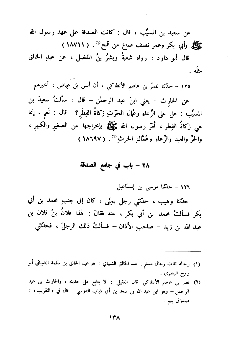 125 - حَدَّثَنَا نَصْرُ بْنُ عَاصِمٍ الْأَنْطَاكِيُّ، أَنَّ أَنَسَ بْنَ عِيَاضٍ، أَخْبَرَهُمْ عَنِ الْحَارِثِ يَعْنِي ابْنَ عَبْدِ الرَّحْمَنِ، قَالَ: سَأَلْتُ سَعِيدَ بْنَ الْمُسَيِّبِ هَلْ عَلَى الرِّعَاءِ وَعُمَالِ الْحَرْثِ زَكَاةُ الْفِطْرِ؟ قَالَ: نَعَمْ، إِنَّمَا هِيَ زَكَاةُ الْفِطْرِ، «§أَمَرَ رَسُولُ اللَّهِ صَلَّى اللهُ عَلَيْهِ وَسَلَّمَ بِإِخْرَاجِهَا عَنِ الصَّغِيرِ وَالْكَبِيرِ وَالْحُرِّ وَالْعَبْدِ وَالرِّعَاءِ وَعُمَالِ الْحَرْثِ»