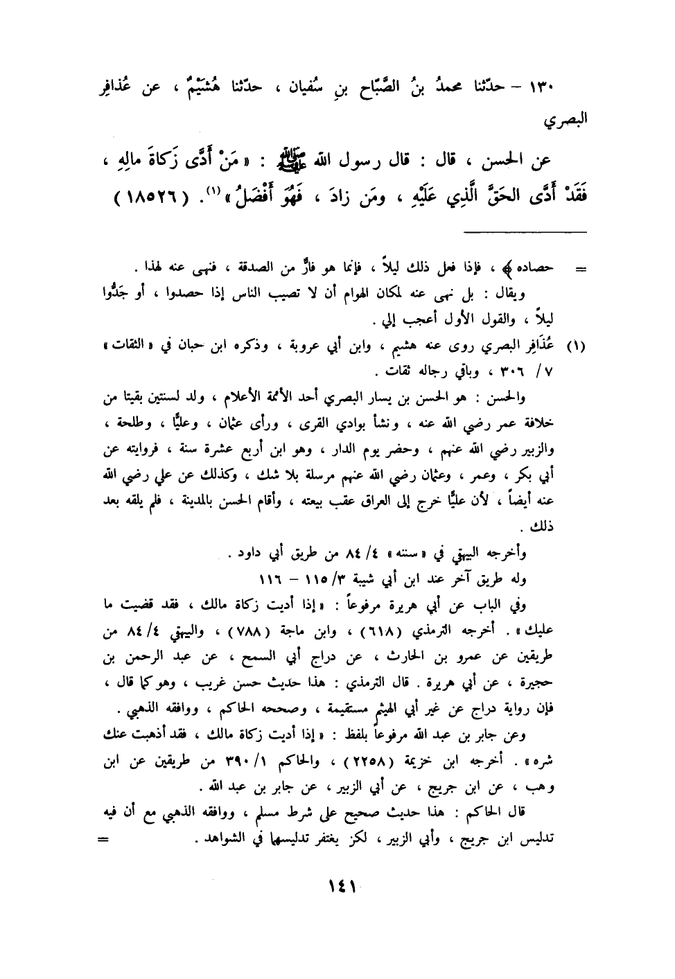130 - حَدَّثَنَا مُحَمَّدُ بْنُ الصَّبَّاحِ بْنِ سُفْيَانَ، حَدَّثَنَا هُشَيْمٌ، عَنْ عُذَافِرٍ الْبَصْرِيِّ، عَنِ الْحَسَنِ قَالَ: قَالَ رَسُولُ اللَّهِ صَلَّى اللهُ عَلَيْهِ وَسَلَّمَ: «§مَنْ أَدَّى زَكَاةَ مَالِهِ فَقَدْ أَدَّى الْحَقَّ الَّذِي عَلَيْهِ، وَمَنْ زَادَ فَهُوَ أَفْضَلُ»