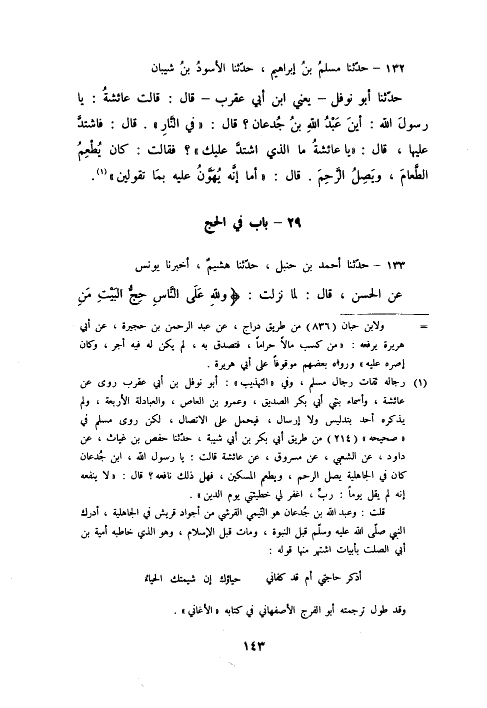 132 - حَدَّثَنَا مُسْلِمُ بْنُ إِبْرَاهِيمَ، حَدَّثَنَا الْأَسْوَدُ بْنُ شَيْبَانَ، حَدَّثَنَا أَبُو نَوْفَلٍ يَعْنِي ابْنَ أَبِي عَقْرَبٍ، قَالَ: قَالَتْ عَائِشَةُ: يَا رَسُولَ اللَّهِ §أَيْنَ عَبْدُ اللَّهِ بْنُ جُدْعَانَ، قَالَ: «فِي النَّارِ» ، قَالَ: فَاشْتَدَّ عَلَيْهَا، قَالَ: «يَا عَائِشَةُ، مَا الَّذِي اشْتَدَّ عَلَيْكِ» ، فَقَالَتْ: كَانَ يُطْعِمُ الطَّعَامِ وَيَصِلُ الرَّحِمَ، قَالَ: «أَمَا إِنَّهُ يُهَوَّنُ عَلَيْهِ بِمَا تَقُولِينَ»