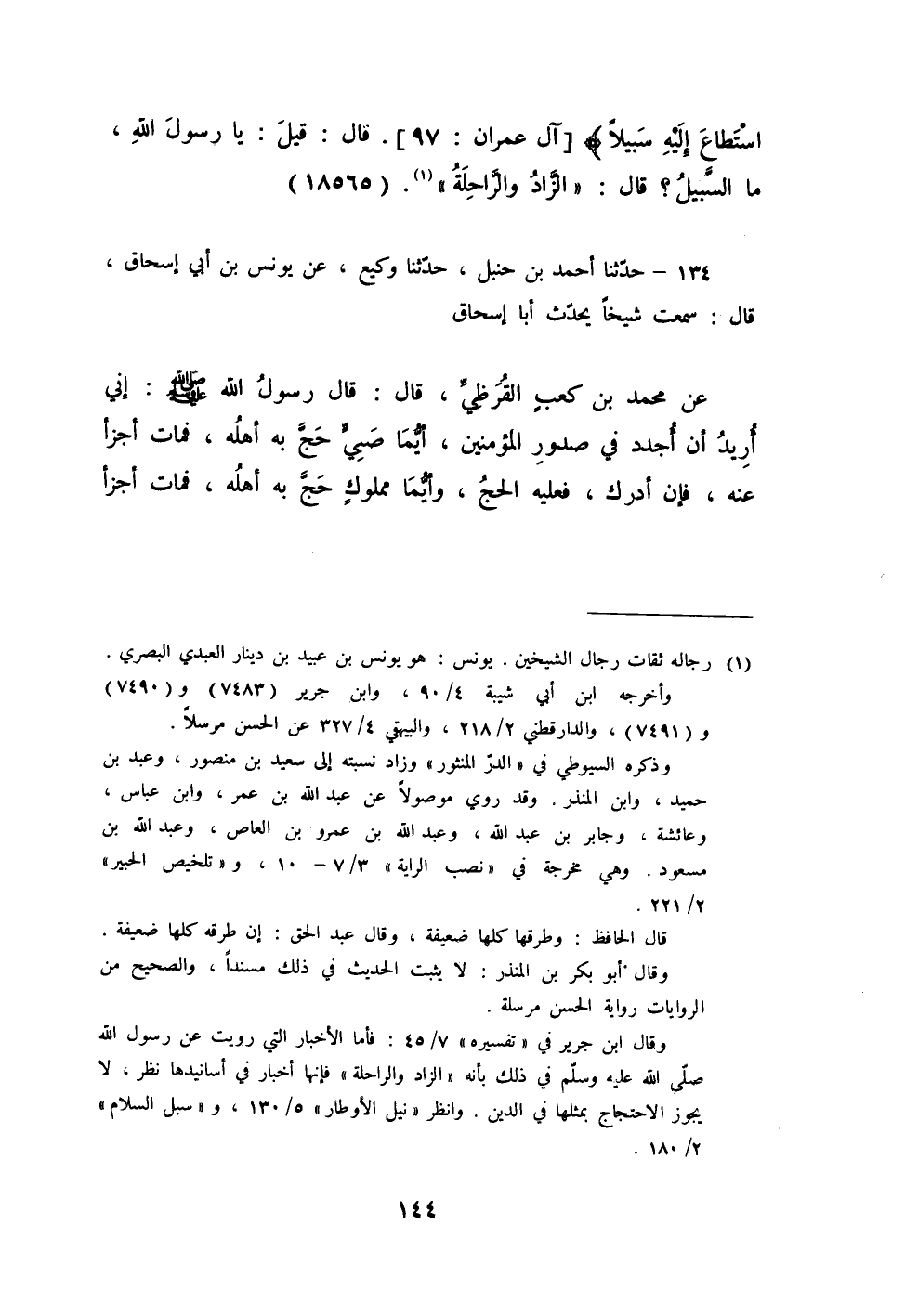 134 - حَدَّثَنَا أَحْمَدُ بْنُ حَنْبَلٍ، حَدَّثَنَا وَكِيعٌ، عَنْ يُونُسَ بْنِ أَبِي إِسْحَاقَ، قَالَ: سَمِعْتُ شَيْخًا، يُحَدِّثُ أَبَا إِسْحَاقَ عَنْ مُحَمَّدِ بْنِ كَعْبٍ الْقُرَظِيِّ، قَالَ: قَالَ رَسُولُ اللَّهِ صَلَّى اللهُ عَلَيْهِ وَسَلَّمَ: «إِنِّي أُرِيدُ أَنْ أُجَدِّدَ فِي صُدُورِ الْمُؤْمِنِينَ، §أَيُّمَا صَبِيٍّ حَجَّ بِهِ أَهْلُهُ فَمَاتَ أَجْزَأَ عَنْهُ فَإِنْ أَدْرَكَ فَعَلَيْهِ الْحَجُّ، وَأَيُّمَا مَمْلُوكٍ حَجَّ بِهِ أَهْلُهُ فَمَاتَ أَجْزَأَ -[145]- عَنْهُ فَإِنْ أُعْتِقَ فَعَلَيْهِ الْحَجُّ»
