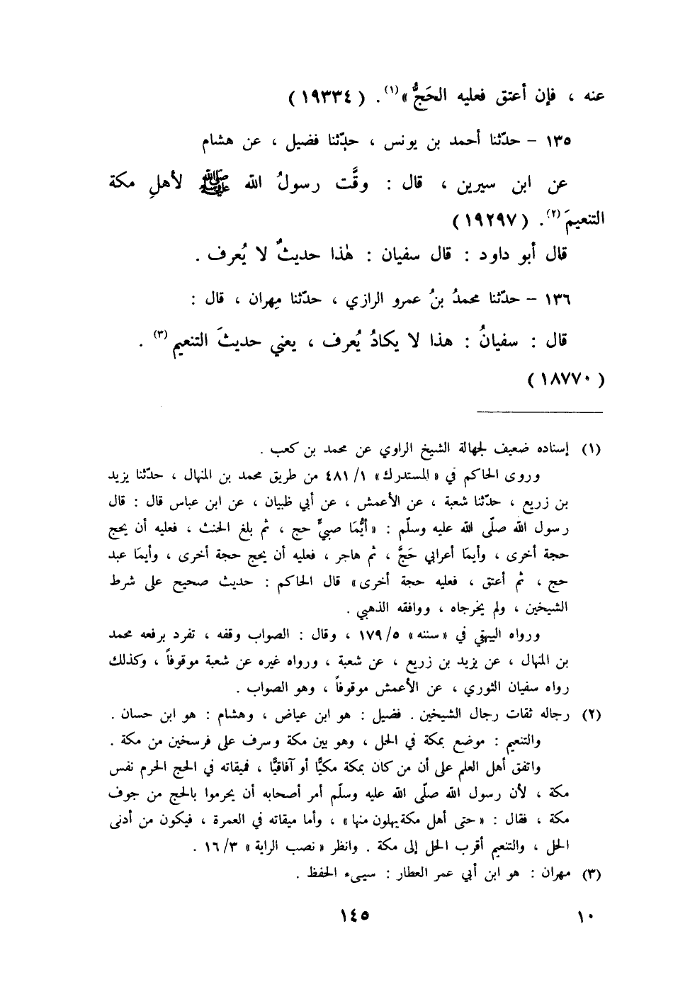 135 - حَدَّثَنَا أَحْمَدُ بْنُ يُونُسَ، حَدَّثَنَا فُضَيْلٌ، عَنْ هِشَامٍ، عَنِ ابْنِ سِيرِينَ، قَالَ: «§وَقَّتَ رَسُولُ اللَّهِ صَلَّى اللهُ عَلَيْهِ وَسَلَّمَ لِأَهْلِ مَكَّةَ التَّنْعِيمَ» قَالَ أَبُو دَاوُدَ: قَالَ سُفْيَانُ: هَذَا حَدِيثٌ لَا يُعْرَفُ،