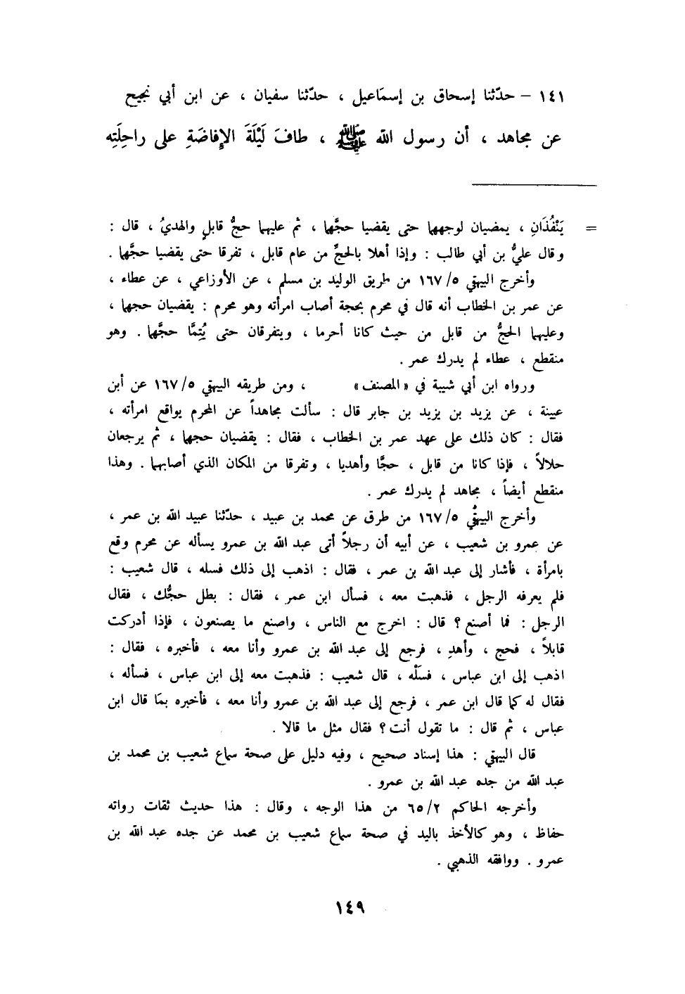 حَدَّثَنَا إِسْحَاقُ بْنُ إِسْمَاعِيلَ، حَدَّثَنَا سُفْيَانُ، عَنِ ابْنِ أَبِي نَجِيحٍ، عَنْ مُجَاهِدٍ، أَنَّ رَسُولَ اللَّهِ صَلَّى اللهُ عَلَيْهِ وَسَلَّمَ «§طَافَ لَيْلَةَ الْإِفَاضَةِ عَلَى رَاحِلَتِهِ -[150]- يَعْنِي بِمِحْجَنِهِ يَسْتَلِمُ الرُّكْنَ، وَيُقَبِّلُ الْمِحْجَنَ»