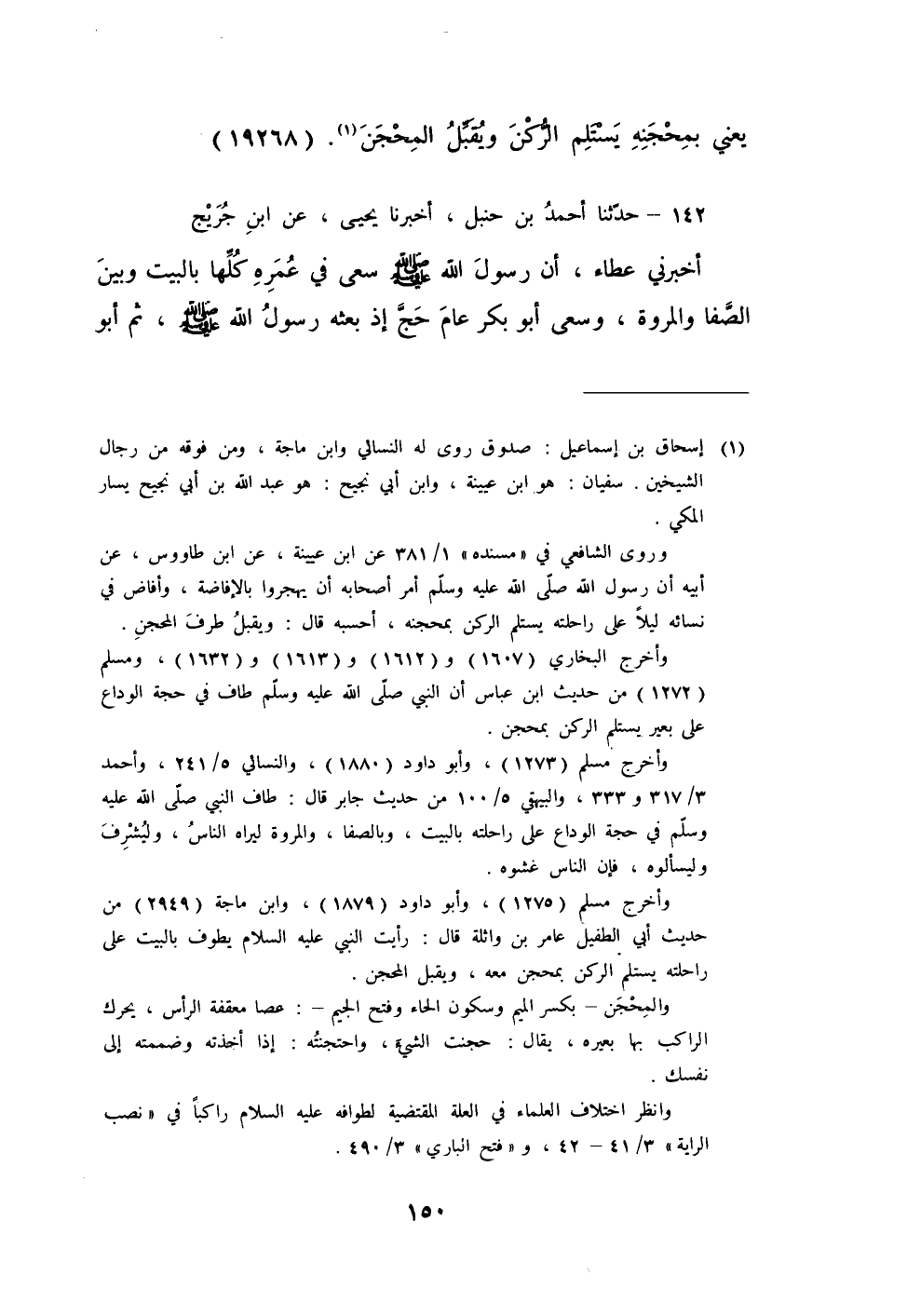 142 - حَدَّثَنَا أَحْمَدُ بْنُ حَنْبَلٍ، أَخْبَرَنَا يَحْيَى، عَنِ ابْنِ جُرَيْجٍ، أَخْبَرَنِي عَطَاءٌ، أَنَّ رَسُولَ اللَّهِ صَلَّى اللهُ عَلَيْهِ وَسَلَّمَ «§سَعَى فِي عُمَرِهِ كُلِّهَا بِالْبَيْتِ وَبَيْنَ الصَّفَا وَالْمَرْوَةِ» ، وَسَعَى أَبُو بَكْرٍ عَامَ حَجَّ إِذْ بَعَثَهُ رَسُولُ اللَّهَ صَلَّى اللهُ عَلَيْهِ وَسَلَّمَ، ثُمَّ أَبُو -[151]- بَكْرٍ وَعُمَرُ وَعُثْمَانُ وَالْخُلَفَاءُ هَلُمَّ جَرًّا يَسْعَوْنَ كَذَلِكَ " قَالَ أَبُو دَاوُدَ: وَقَدْ أُسْنِدَ هَذَا الْحَدِيثُ، وَلَا يَصِحُّ وَهَذَا هُوَ الصَّحِيحُ