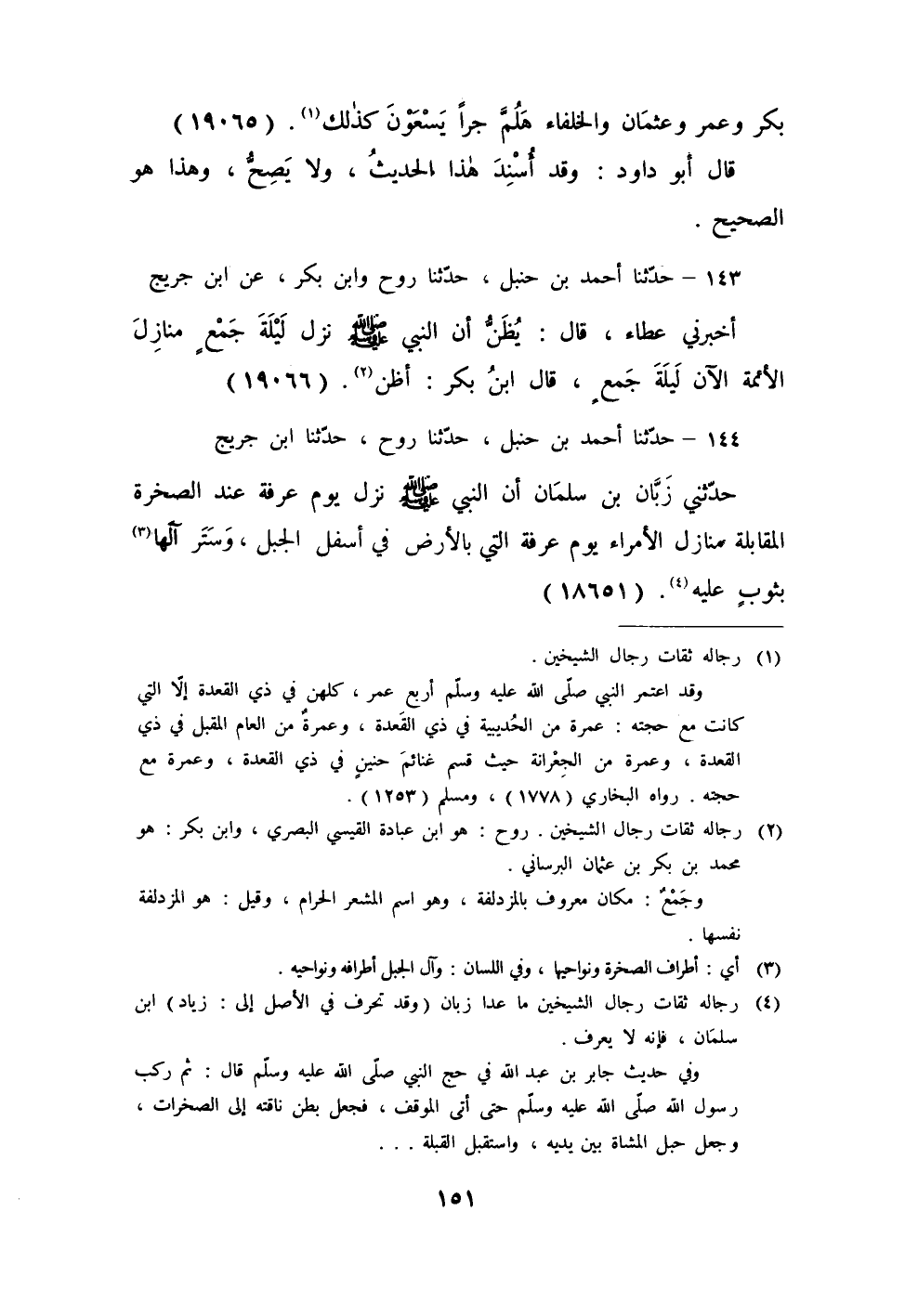 143 - حَدَّثَنَا أَحْمَدُ بْنُ حَنْبَلٍ، حَدَّثَنَا رَوْحٌ، وَابْنُ بَكْرٍ، عَنِ ابْنِ جُرَيْجٍ، أَخْبَرَنِي عَطَاءٌ، قَالَ: يُظَنُّ أَنَّ النَّبِيَّ صَلَّى اللهُ عَلَيْهِ وَسَلَّمَ «§نَزَلَ لَيْلَةَ جَمْعٍ مَنَازِلِ الْأَئِمَّةِ الْآنَ لَيْلَةَ جَمْعٍ» قَالَ: ابْنُ بَكْرٍ أَظُنُّ