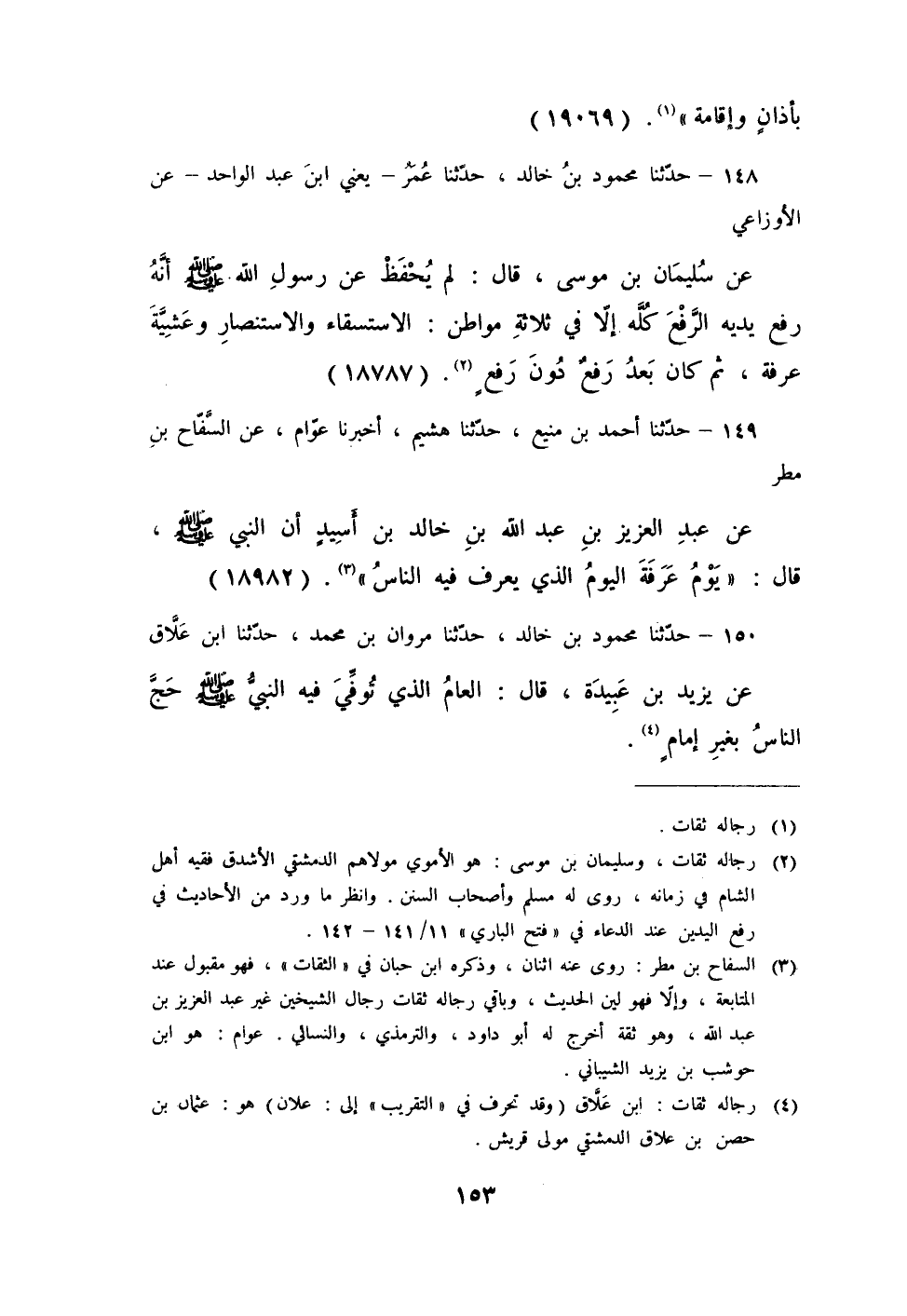 149 - حَدَّثَنَا أَحْمَدُ بْنُ مَنِيعٍ، حَدَّثَنَا هُشَيْمٌ، أَخْبَرَنَا عَوَّامٌ، عَنِ السَّفَّاحِ بْنِ مَطَرٍ، عَنْ عَبْدِ الْعَزِيزِ بْنِ عَبْدِ اللَّهِ بْنِ خَالِدِ بْنِ أُسَيْدٍ، أَنَّ النَّبِيَّ صَلَّى اللهُ عَلَيْهِ وَسَلَّمَ قَالَ: «§يَوْمُ عَرَفَةَ الْيَوْمُ الَّذِي يُعْرَفُ فِيهِ النَّاسُ»