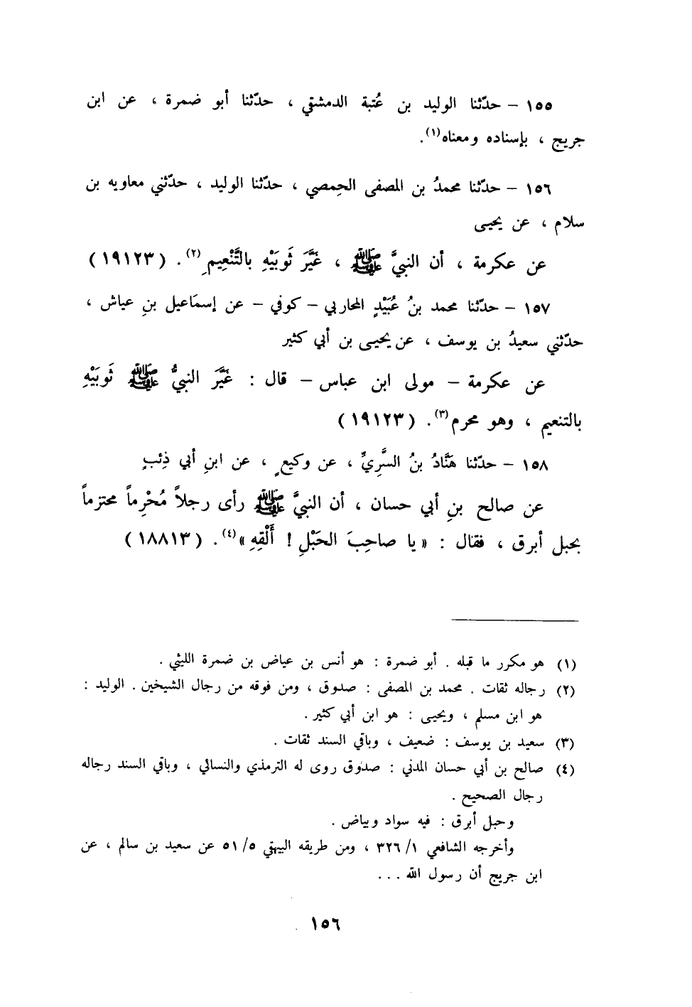 156 - حَدَّثَنَا مُحَمَّدُ بْنُ الْمُصَفَّى الْحِمْصِيُّ، حَدَّثَنَا الْوَلِيدُ، حَدَّثَنِي مُعَاوِيَةُ بْنُ سَلَّامٍ، عَنْ يَحْيَى، عَنْ عِكْرِمَةَ أَنَّ النَّبِيَّ صَلَّى اللهُ عَلَيْهِ وَسَلَّمَ «§غَيَّرَ ثَوْبَيْهِ بِالتَّنْعِيمِ»