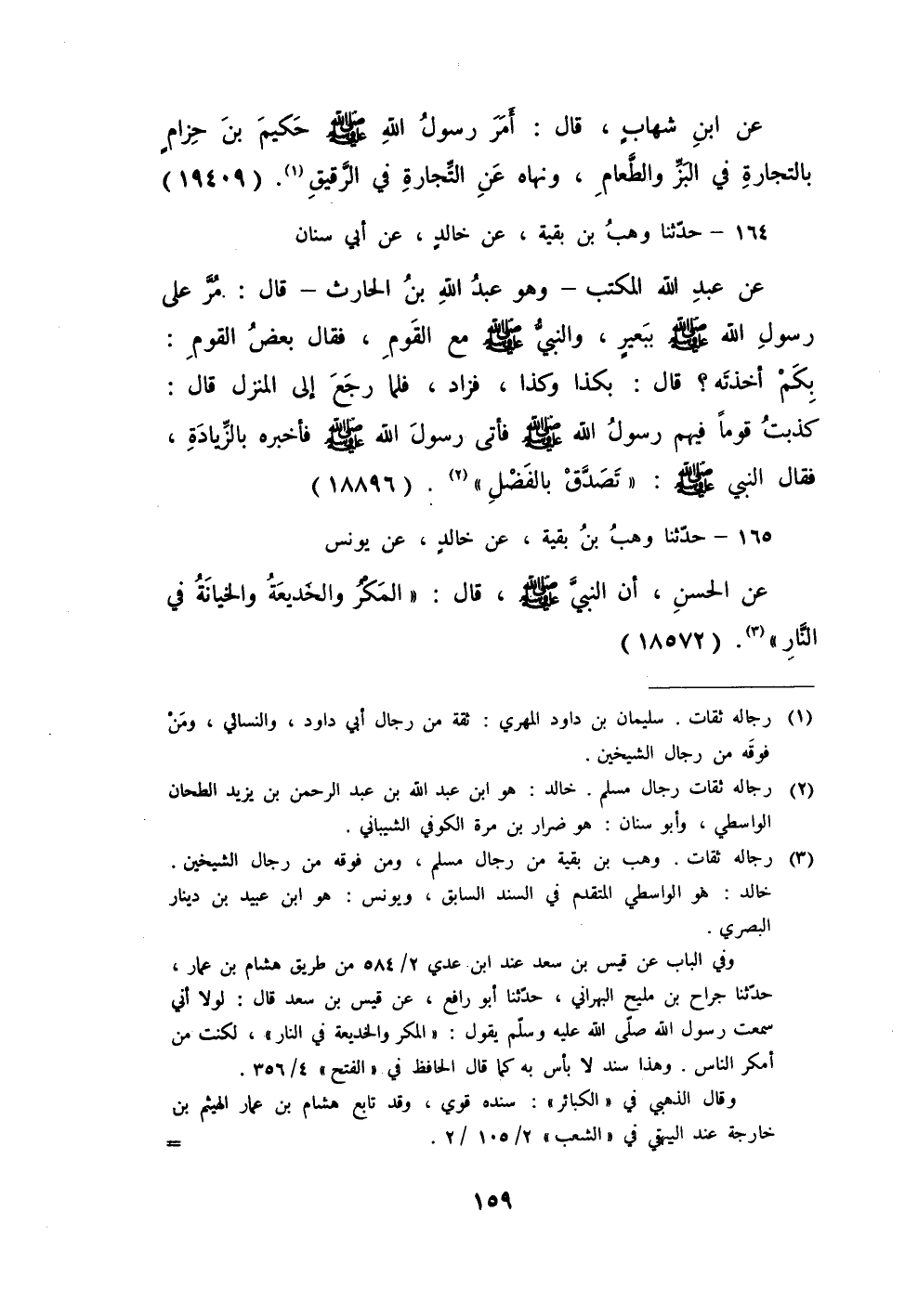 164 - حَدَّثَنَا وَهْبُ بْنُ بَقِيَّةَ، عَنْ خَالِدٍ، عَنْ أَبِي سِنَانٍ، عَنْ عَبْدِ اللَّهِ الْمُكْتِبِ وَهُوَ عَبْدُ اللَّهِ بْنُ الْحَارِثِ، قَالَ: مُرَّ عَلَى رَسُولِ اللَّهِ صَلَّى اللهُ عَلَيْهِ وَسَلَّمَ بِبَعِيرٍ، وَالنَّبِيُّ صَلَّى اللهُ عَلَيْهِ وَسَلَّمَ مَعَ الْقَوْمِ، فَقَالَ: بَعْضُ الْقَوْمِ: بِكَمْ أَخَذْتَهُ؟ قَالَ: بِكَذَا وَكَذَا، فَزَادَ، فَلَمَّا رَجَعَ إِلَى الْمَنْزِلِ قَالَ: كَذَبْتُ قَوْمًا فِيهِمْ رَسُولُ اللَّهِ صَلَّى اللهُ عَلَيْهِ وَسَلَّمَ، فَأَتَى رَسُولَ اللَّهِ صَلَّى اللهُ عَلَيْهِ وَسَلَّمَ فَأَخْبَرَهُ بِالزِّيَادَةِ، فَقَالَ النَّبِيُّ صَلَّى اللهُ عَلَيْهِ وَسَلَّمَ: «§تَصَدَّقْ بِالْفَضْلِ»