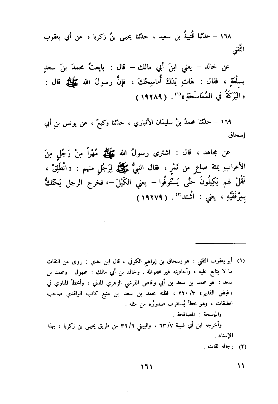 168 - حَدَّثَنَا قُتَيْبَةُ بْنُ سَعِيدٍ، حَدَّثَنَا يَحْيَى بْنُ زَكَرِيَّا، عَنْ أَبِي يَعْقُوبَ الثَّقَفِيِّ، عَنْ خَالِدٍ يَعْنِي ابْنَ أَبِي مَالِكٍ، قَالَ: بَايَعْتُ مُحَمَّدَ بْنَ سَعْدٍ بِسِلْعَةٍ فَقَالَ: هَاتِ يَدَكَ أُمَاسِحْكَ، فَإِنَّ رَسُولَ اللَّهِ صَلَّى اللهُ عَلَيْهِ وَسَلَّمَ قَالَ: «§الْبَرَكَةُ فِي الْمُمَاسَحَةِ»
