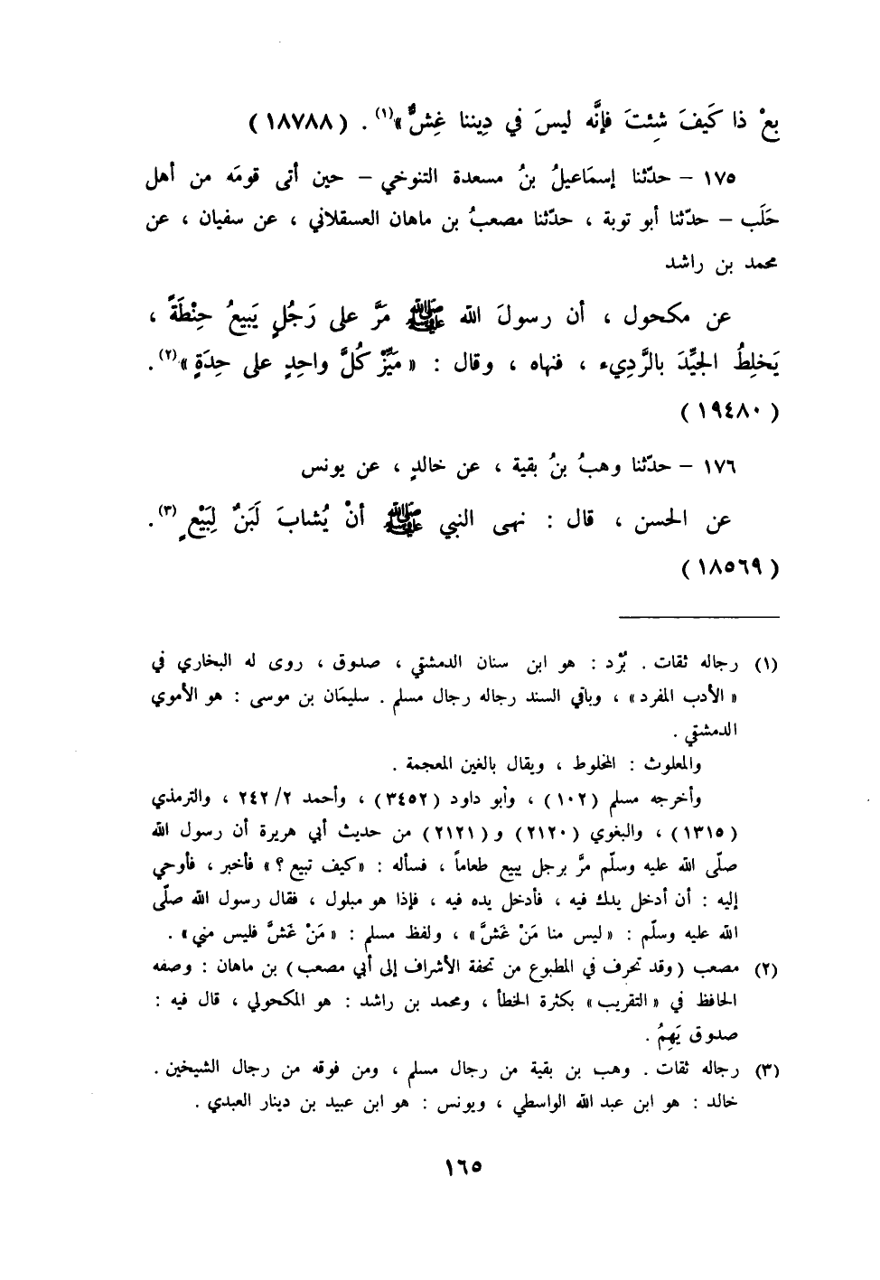 175 - حَدَّثَنَا إِسْمَاعِيلُ بْنُ مَسْعَدَةَ التَّنُوخِيُّ، حِينَ أَتَى قَوْمَهُ مِنْ أَهْلِ حَلَبَ، حَدَّثَنَا أَبُو تَوْبَةَ، حَدَّثَنَا مُصْعَبُ بْنُ مَاهَانَ الْعَسْقَلَانِيُّ، عَنْ سُفْيَانَ، عَنْ مُحَمَّدِ بْنِ رَاشِدٍ، عَنْ مَكْحُولٍ أَنَّ رَسُولَ اللَّهِ صَلَّى اللهُ عَلَيْهِ وَسَلَّمَ §مَرَّ عَلَى رَجُلٍ يَبِيعُ حِنْطَةً يَخْلِطُ الْجَيِّدَ بِالرَّدِيءِ، فَنَهَاهُ وَقَالَ: «مَيِّزْ كُلَّ وَاحِدٍ عَلَى حِدَةٍ»