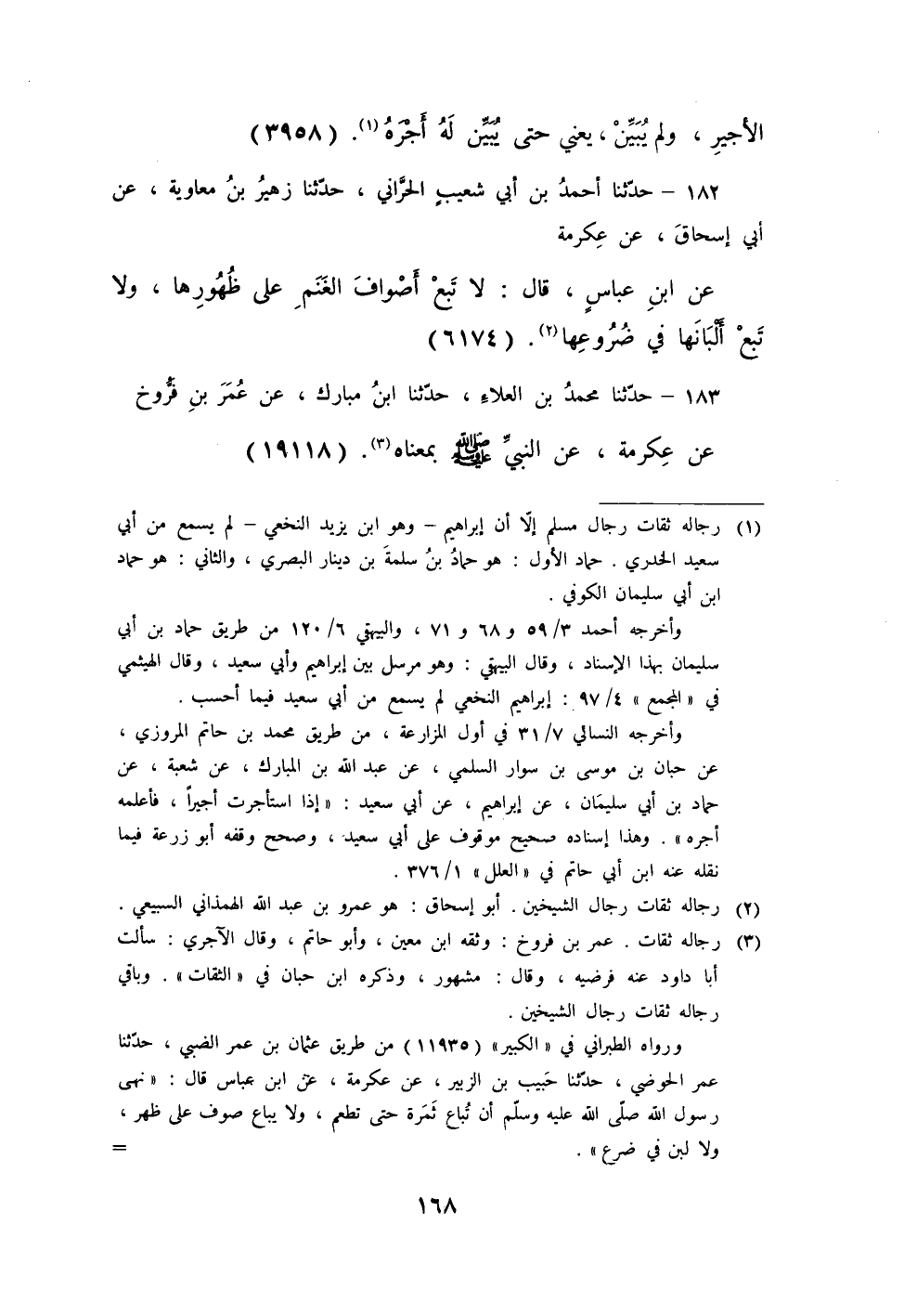 182 - حَدَّثَنَا أَحْمَدُ بْنُ أَبِي شُعَيْبٍ الْحَرَّانِيُّ، حَدَّثَنَا زُهَيْرُ بْنُ مُعَاوِيَةَ، عَنْ أَبِي إِسْحَاقَ، عَنْ عِكْرِمَةَ، عَنِ ابْنِ عَبَّاسٍ، قَالَ: «§لَا تَبِعْ أَصْوَافَ الْغَنَمٍ عَلَى ظُهُورِهَا، وَلَا تَبِعْ أَلْبَانَهَا فِي ضُرُوعِهَا» .