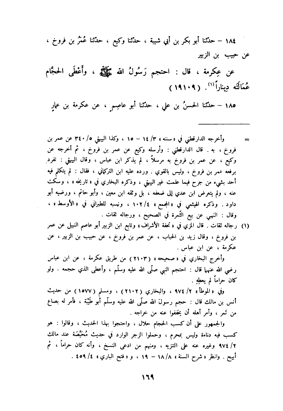 184 - حَدَّثَنَا أَبُو بَكْرِ بْنُ أَبِي شَيْبَةَ، حَدَّثَنَا وَكِيعٌ، حَدَّثَنَا عُمَرُ بْنُ فَرُّوخَ، عَنْ حَبِيبِ بْنِ الزُّبَيْرِ، عَنْ عِكْرِمَةَ، قَالَ: «§احْتَجَمَ رَسُولُ اللَّهِ صَلَّى اللهُ عَلَيْهِ وَسَلَّمَ وَأَعْطَى الْحَجَّامَ عُمَالَتَهُ دِينَارًا»