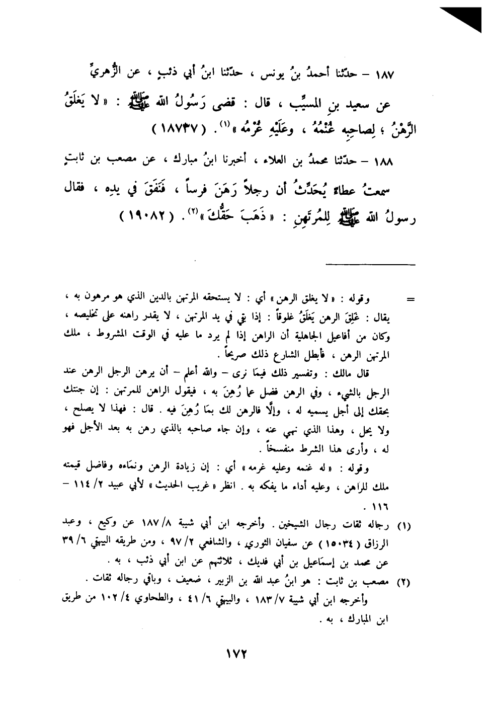 187 - حَدَّثَنَا أَحْمَدُ بْنُ يُونُسَ، حَدَّثَنَا ابْنُ أَبِي ذِئْبٍ، عَنْ الزُّهْرِيِّ، عَنْ سَعِيدِ بْنِ الْمُسَيِّبِ، قَالَ: قَضَى رَسُولُ اللَّهِ صَلَّى اللهُ عَلَيْهِ وَسَلَّمَ: «§لَا يَغْلَقُ الرَّهْنُ لِصَاحِبِهِ غُنْمُهُ وَعَلَيْهِ غُرْمُهُ»