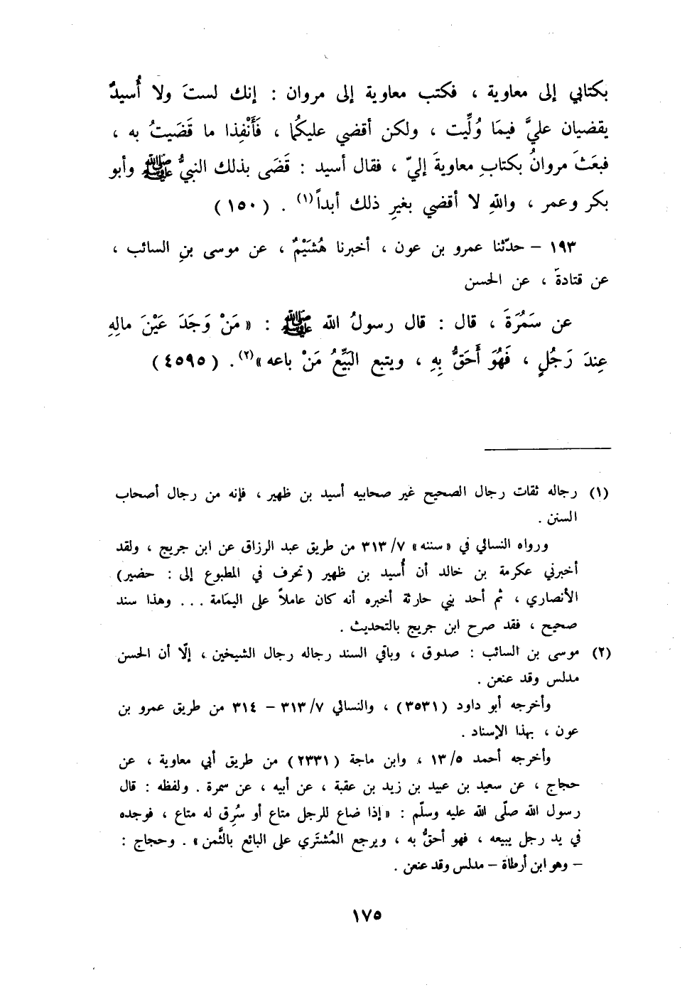 193 - حَدَّثَنَا عَمْرُو بْنُ عَوْنٍ، أَخْبَرَنَا هُشَيْمٌ، عَنْ مُوسَى بْنِ السَّائِبِ، عَنْ قَتَادَةَ، عَنِ الْحَسَنِ، عَنْ سَمُرَةَ، قَالَ: قَالَ رَسُولُ اللَّهِ صَلَّى اللهُ عَلَيْهِ وَسَلَّمَ: «§مَنْ وَجَدَ عَيْنَ مَالِهِ عِنْدَ رَجُلٍ فَهُوَ أَحَقُّ بِهِ، وَيَتْبَعُ الْبَيِّعُ مَنْ بَاعَهُ»