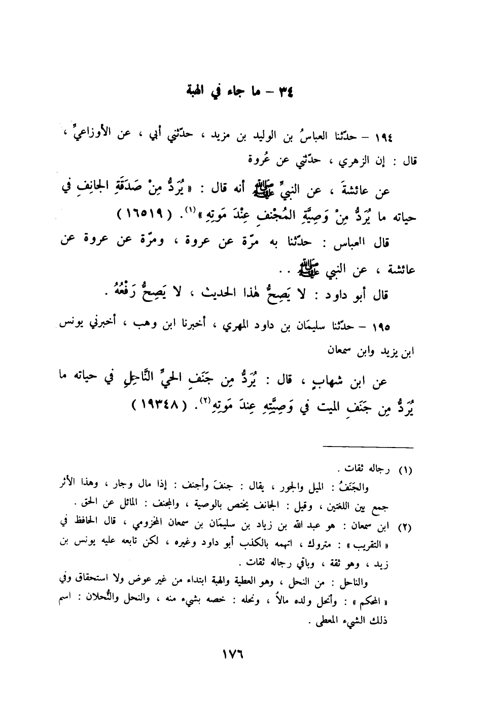 194 - حَدَّثَنَا الْعَبَّاسُ بْنُ الْوَلِيدِ بْنِ مَزْيَدَ، حَدَّثَنِي أَبِي، عَنِ الْأَوْزَاعِيِّ، قَالَ: إِنَّ الزُّهْرِيَّ حَدَّثَنِي، عَنْ عُرْوَةَ، عَنْ عَائِشَةَ، عَنِ النَّبِيِّ صَلَّى اللهُ عَلَيْهِ وَسَلَّمَ أَنَّهُ قَالَ: «§يُرَدُّ مِنْ صَدَقَةِ الْجَانِفِ فِي حَيَاتِهِ مَا يُرَدُّ مِنْ وَصِيَّةِ الْمُجْنِفِ عِنْدَ مَوْتِهِ» قَالَ: الْعَبَّاسُ: حُدِّثْنَا بِهِ مَرَّةً عَنْ عُرْوَةَ، وَمَرَّةً عَنْ عُرْوَةَ، عَنْ عَائِشَةَ، عَنِ النَّبِيِّ صَلَّى اللهُ عَلَيْهِ وَسَلَّمَ. قَالَ أَبُو دَاوُدَ: لَا يَصِحُّ هَذَا الْحَدِيثُ، لَا يَصِحُّ رَفَعُهُ